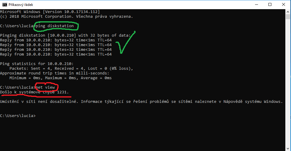 ad 1) net view by měl vypsat minimálně počítač na kterém je spuštěn. Pokud tam skočí sytémová chyba nebude problém v NASu