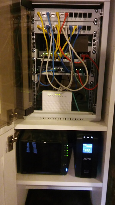 Na chodbě v prvním patře mám ve skříni rack s patch panely a místem pro modem, switche a router viz fotka. V téže skříni pod rackem mám NAS Synology s UPSkou viz foto. Po celém domě mám rozvedenou síť, kde v každé místnosti je minimálně 1 zásuvka (u pracovního místa víc zásuvek) s dvěma keystony sítě a ze všech místností je to husími krky vyvedeno do té rackové skříně na chodbě. Na stropě v podkroví mám talíř AP WIFI a venku pod střechou bude podobný pro venkovní připojení.