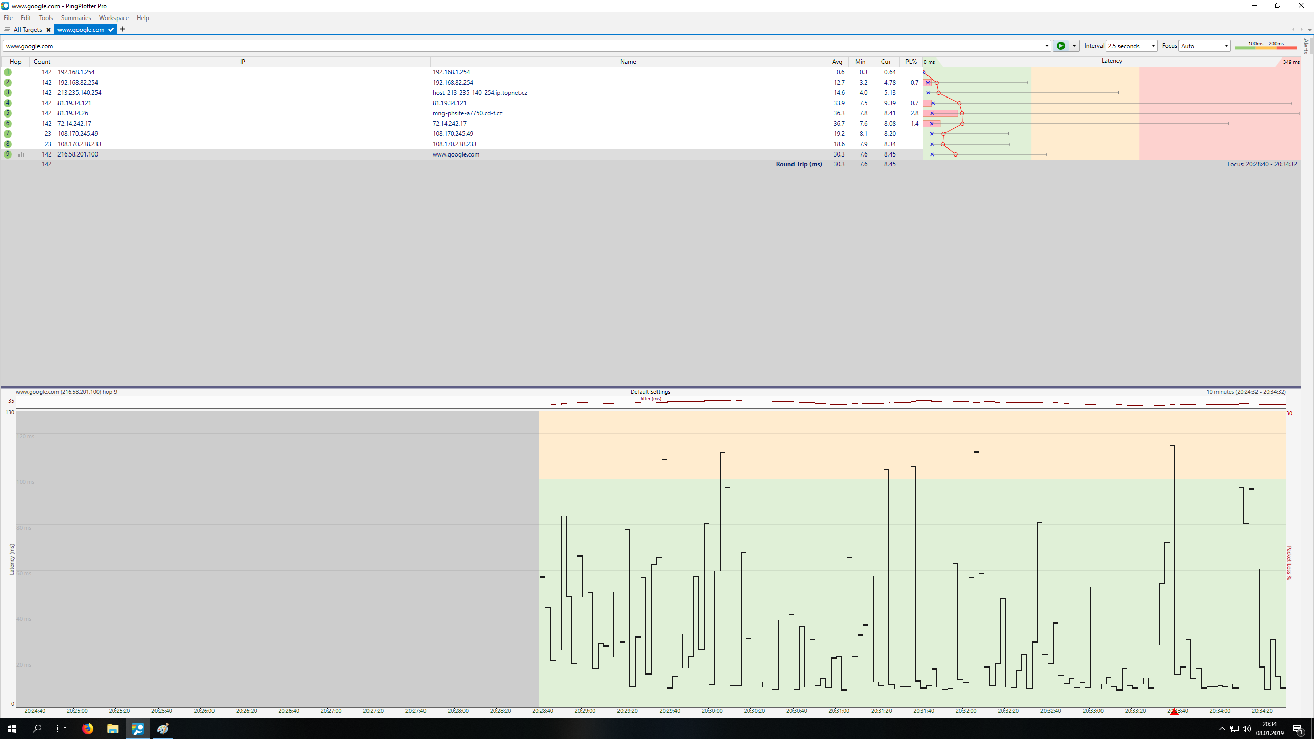 Nevěděl jsem jak to mám přesně měřit přes ten pingpltter, tak jsem vše vypl a dal tam adresu google.com a měřil to přes ten program, během měření jsem na netu/pc nic nedělal
