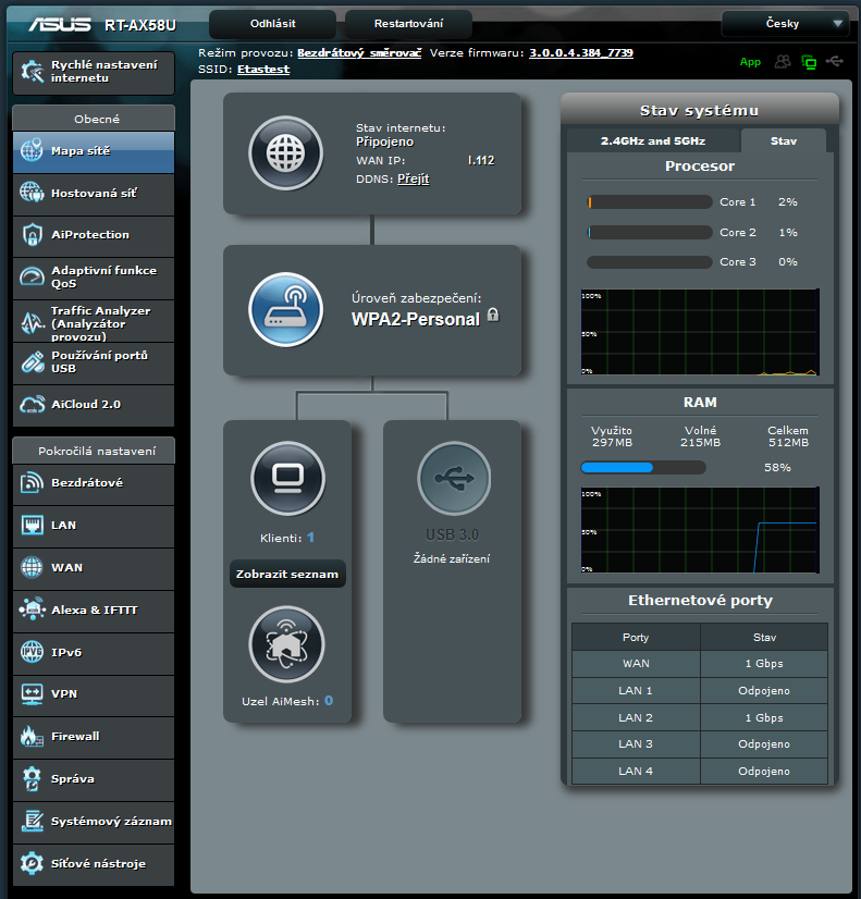 Mapa sítě Po přihlášení k routeru se zobrazí stránka, kde najdete aktuální informace o zatížení procesoru, připojených klientech, obsazených portech, připojeném USB, atd: Hostovaná síť - zde si můžete vytvořit až šest WiFi sítí pro hosty. Hosté připojení k těmto sítím nemají přístup do vaší sítě, pouze k internetu.