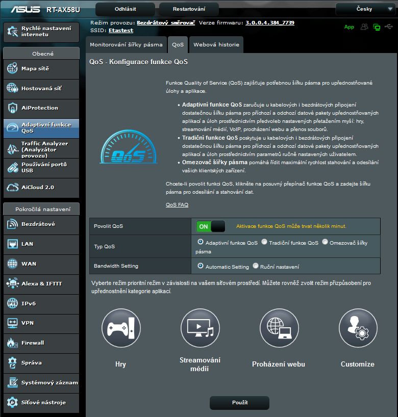 AiProtection - používá produktu TrendMicro k lepšímu zabezpečí routeru. Jednoduše a srozumitelně je zde ukázáno, co byste měli změnit. Adaptivní funkce QoS - Quality of Service - v podstatě přednostní doručování paketů pro služby, které upřednostňujete. V případě adaptivního nastavení můžete volit mezi prioritou pro hry, media, web, nebo si potřebné nastavit sami. A pokud si přejete nastavit omezení rychlosti, jste zde správně. Mimo jiné je zde i možnost sledovat aktuální vytížení šíře pásma pomocí monitoringu. Traffic Analyzer - logování a grafy síťového provozu. Zde můžete třeba objevit největšího "žrouta" proudících dat.
