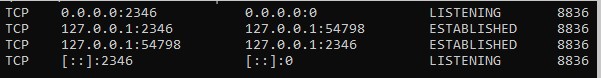 - Na 2346 by nic běžet nemělo – nejsem si jistý, jak to přesně zkontrolovat, ale když vypnu program s hostovaným serverem a zkusím stejnej příkaz netstat jako výše, tak už neukáže listening ani established, ale jen jeden se statusem time_wait.