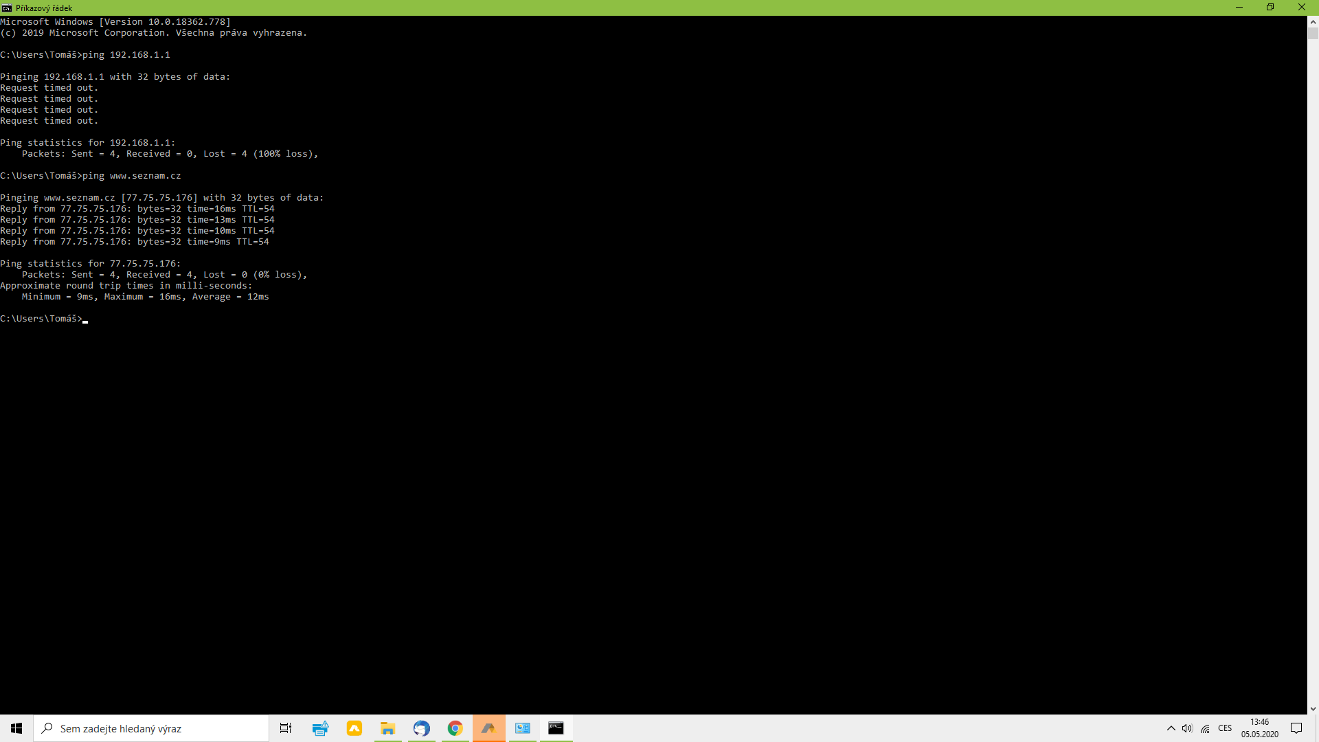 -Zde je screen výpisu ipconfig /all: -inSSIDer: -ping na bránu :) v případě výpadku: -ping na seznam již při opraveném připojení: -přesný typ a výrobce routeru: