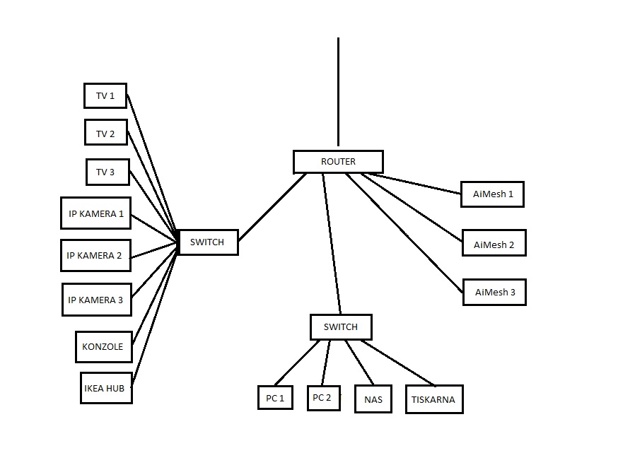 Rád bych pořídil nějaký kvalitní router. Přímo za router bych dal 16ti portový gigabitový switch a z něj dále rozvedl co potřebuji. Asi 10m daleko od routeru bych pořídil další switch, 8mi portový, a tam bych zapojil další zařízení. Dále bych různě po domě rozvedl 3x AiMesh zařízení, tak abych rozšířil wifi o další patra a zahradu.