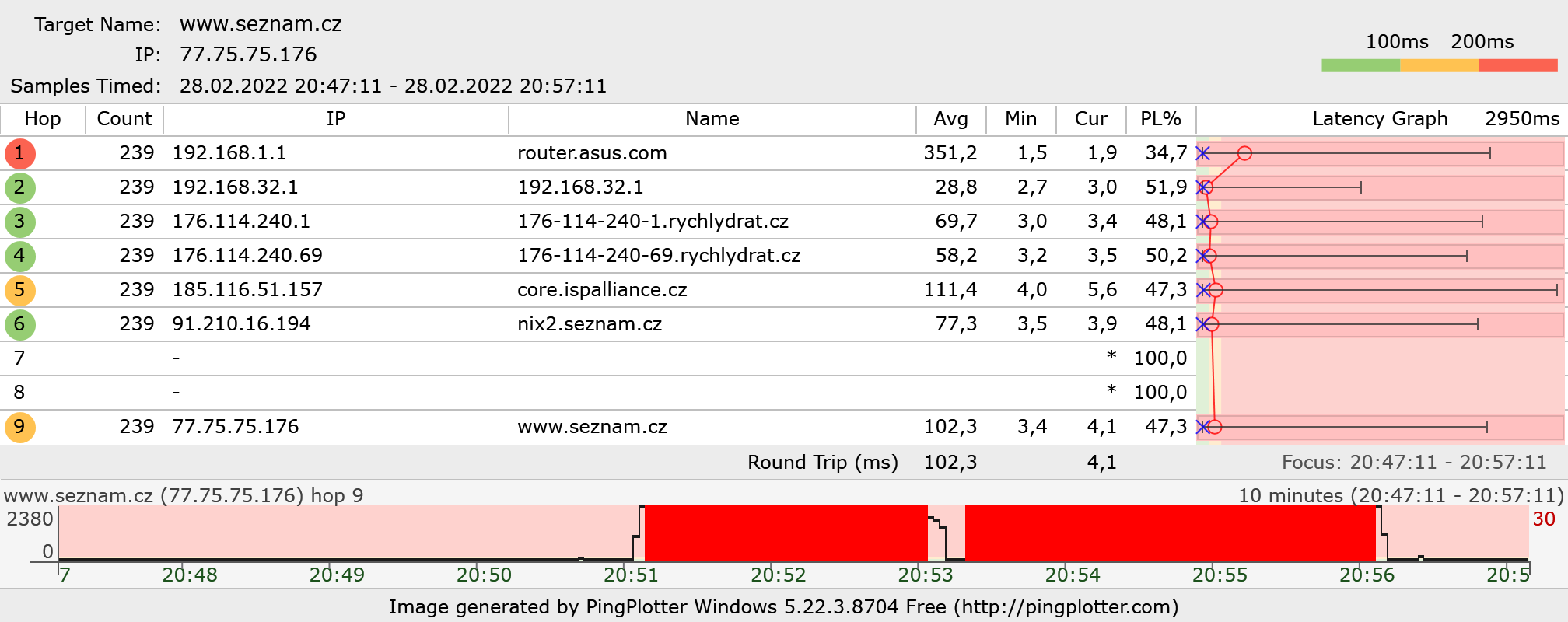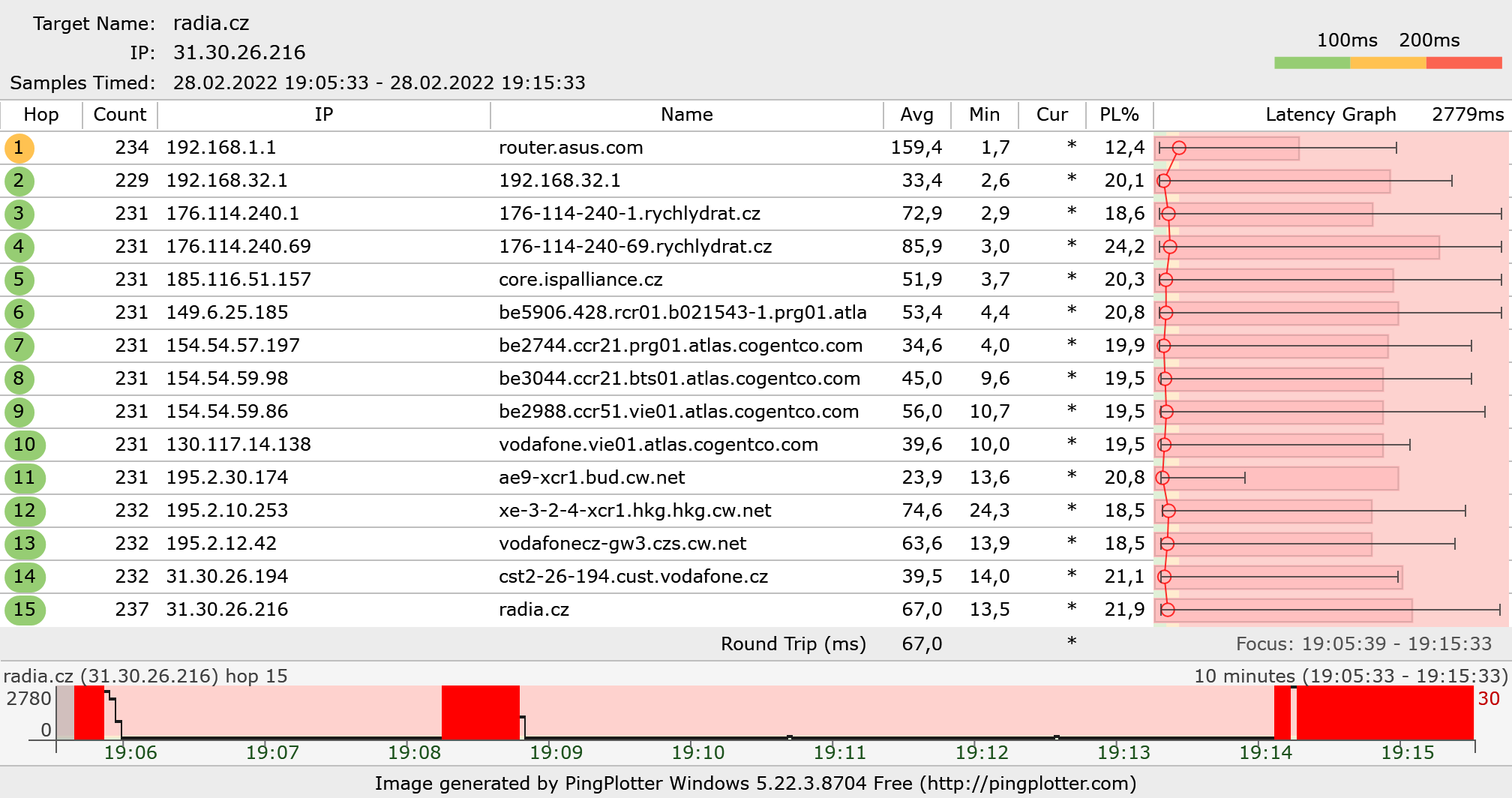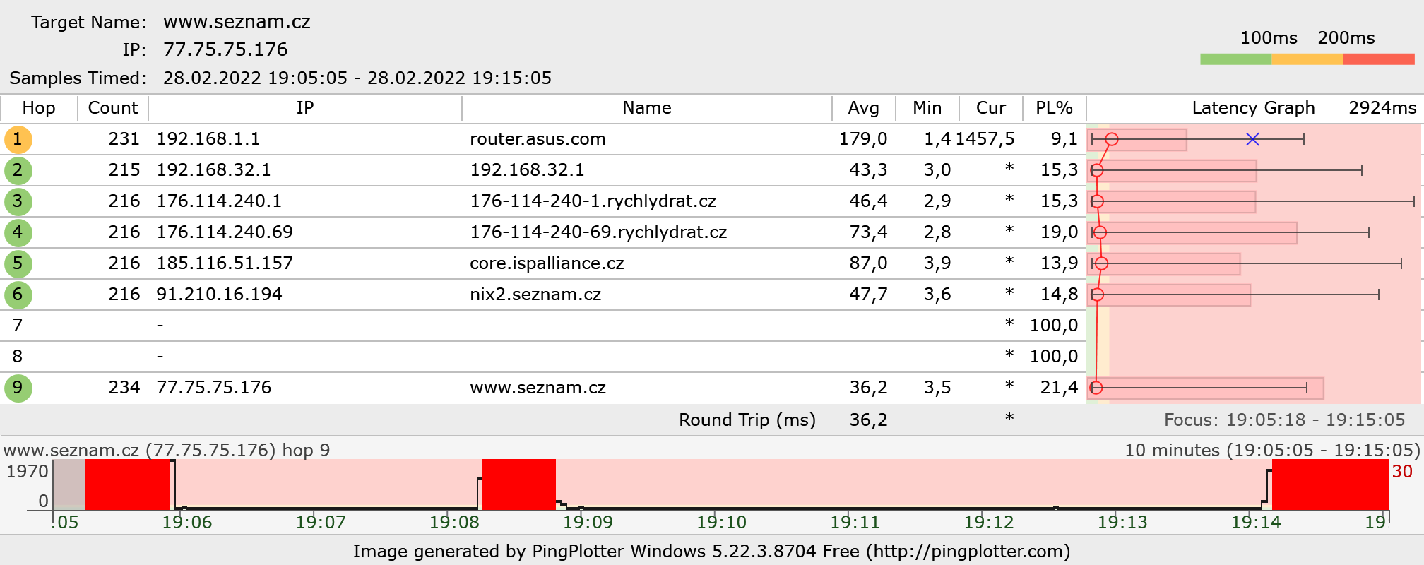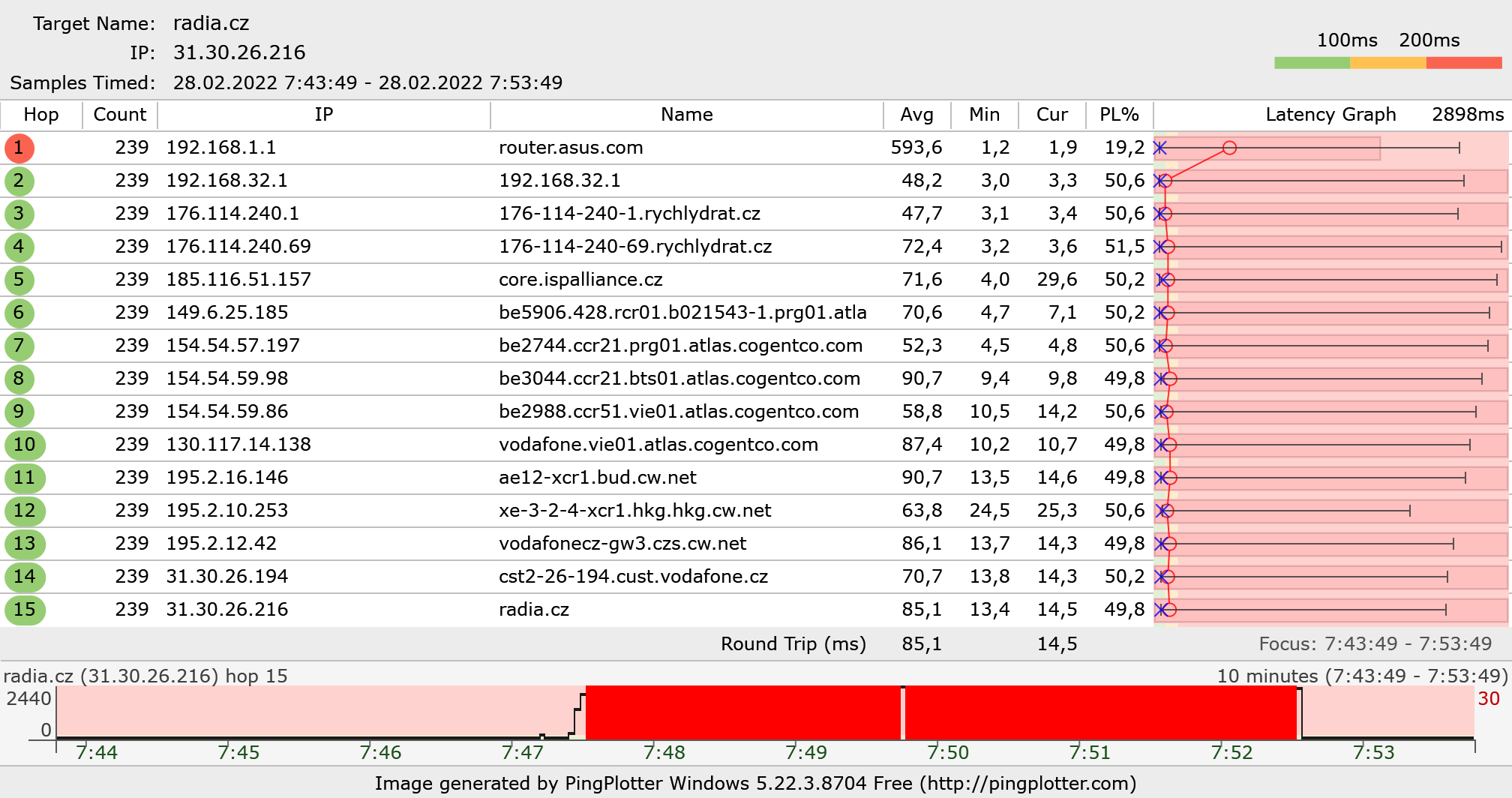 - pingplotter třeba na nějaké internetové rádio v době výpadku