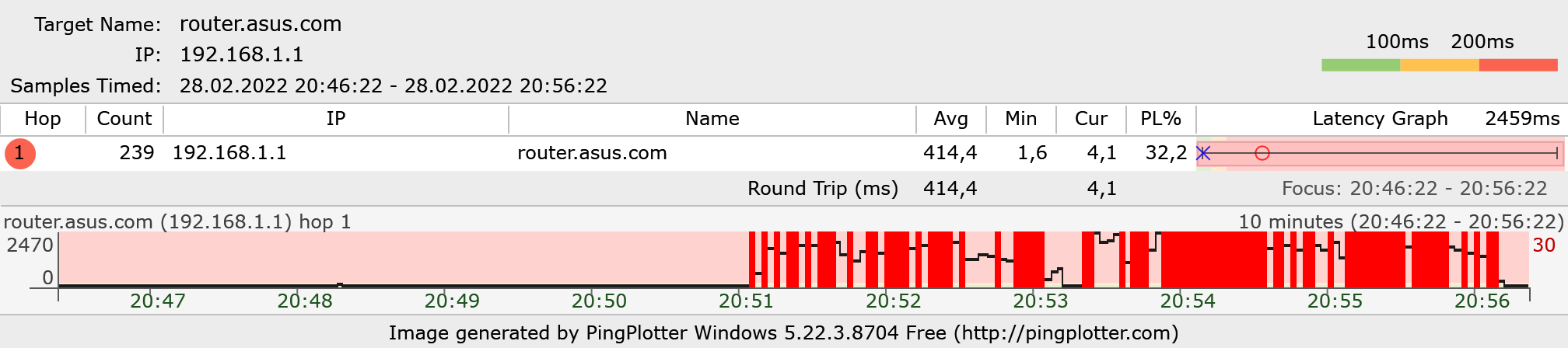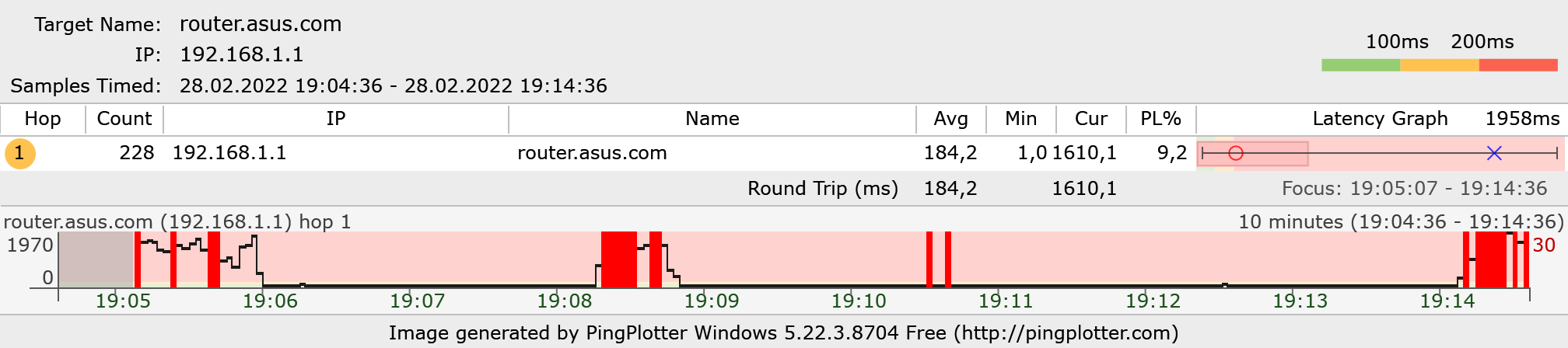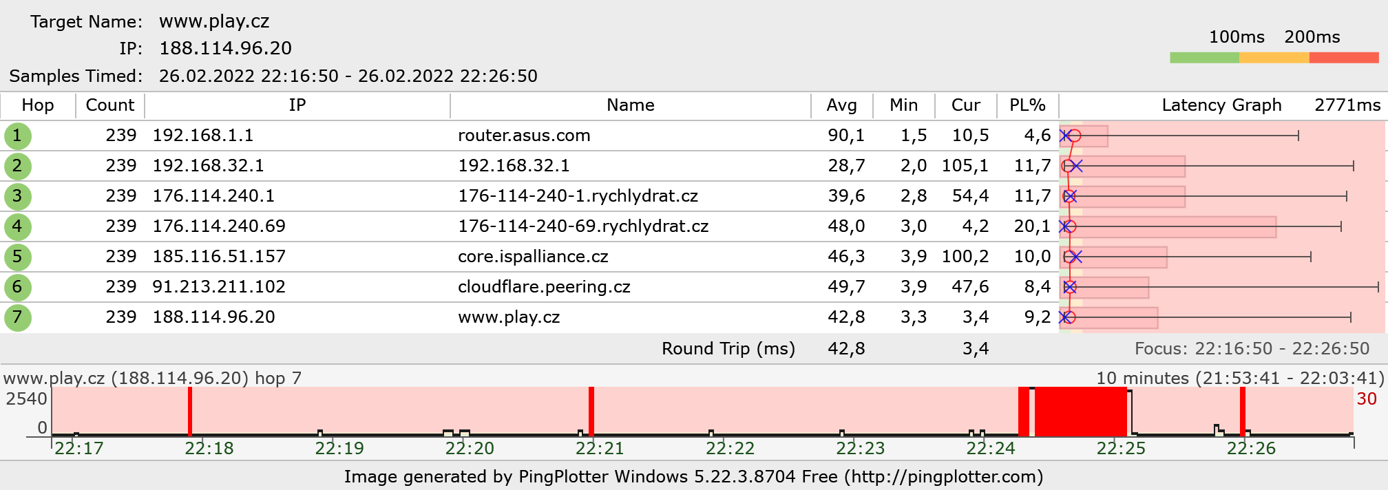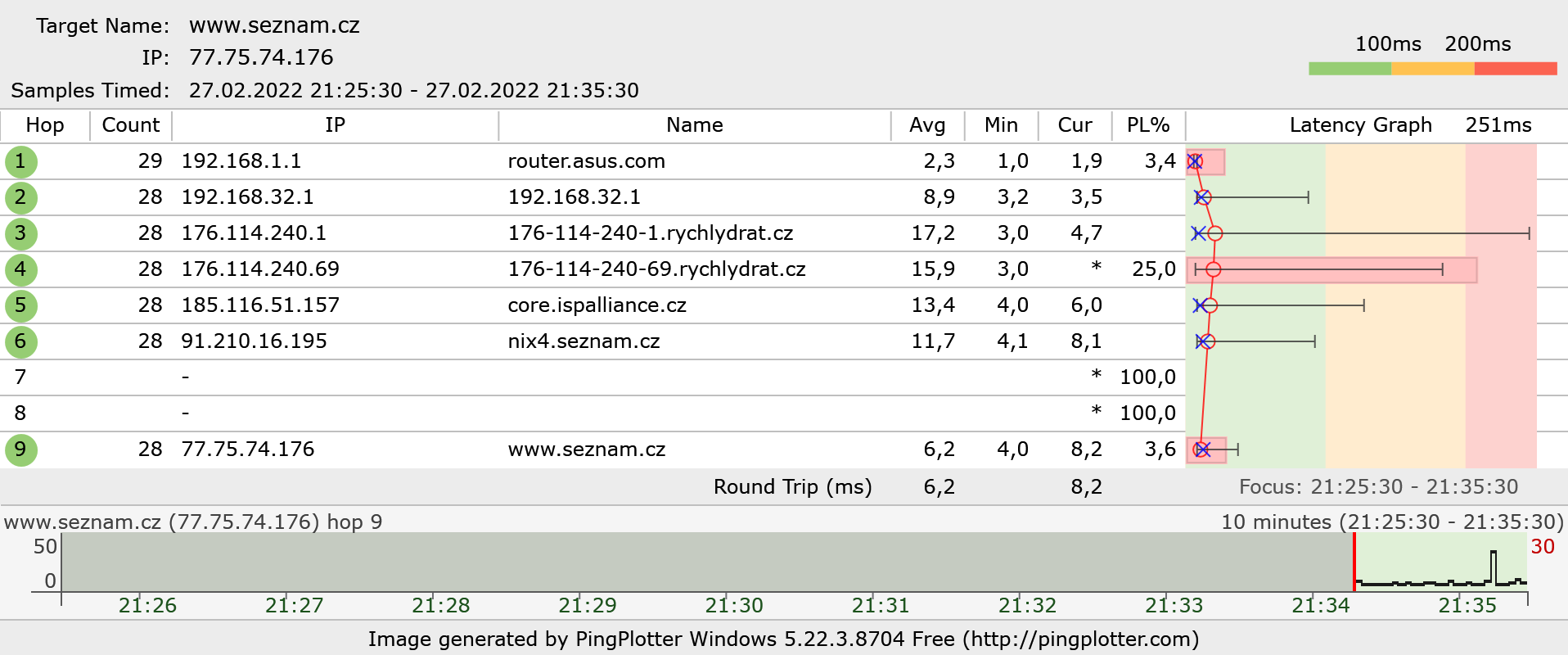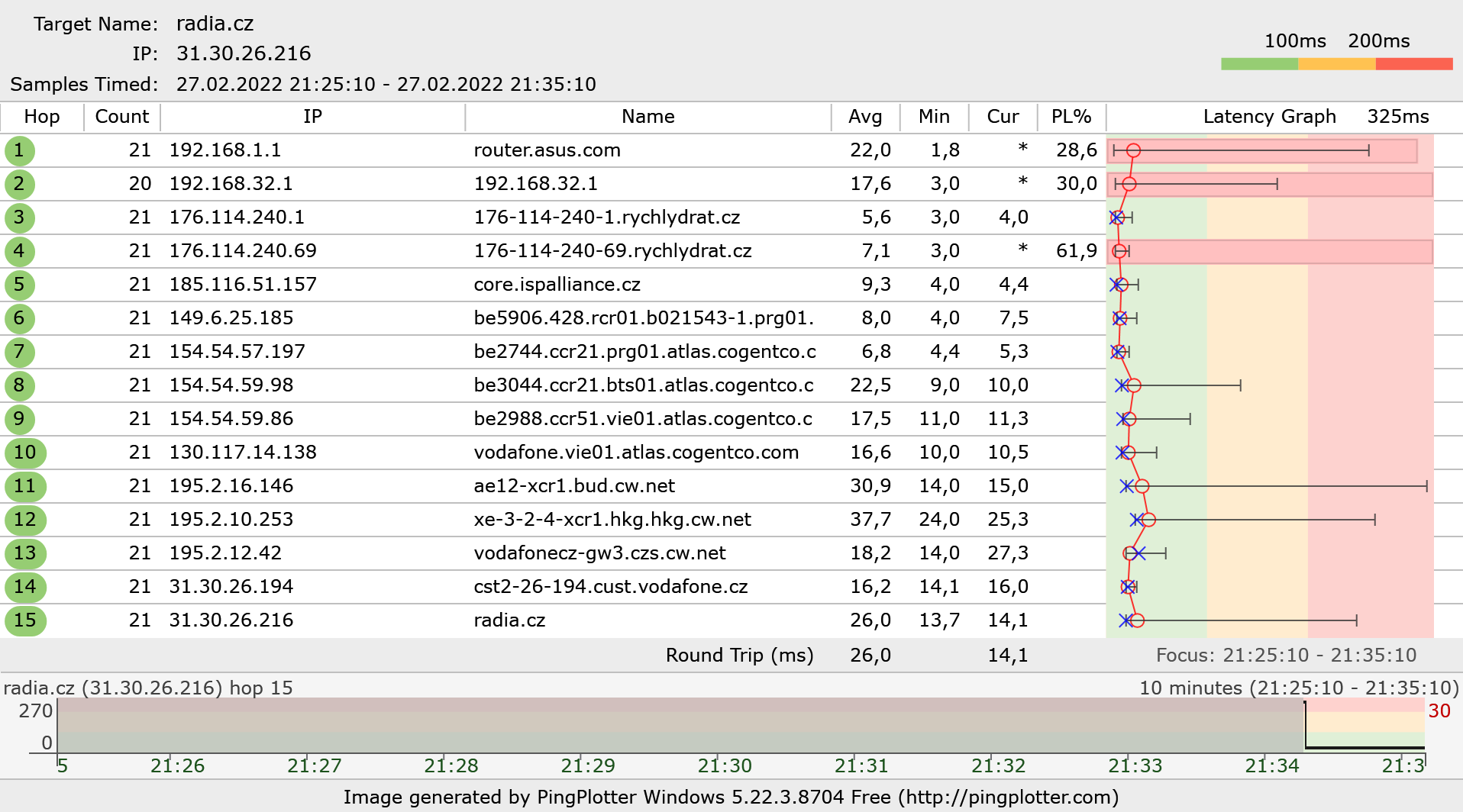 - pingplotter třeba na nějaké internetové rádio v době výpadku