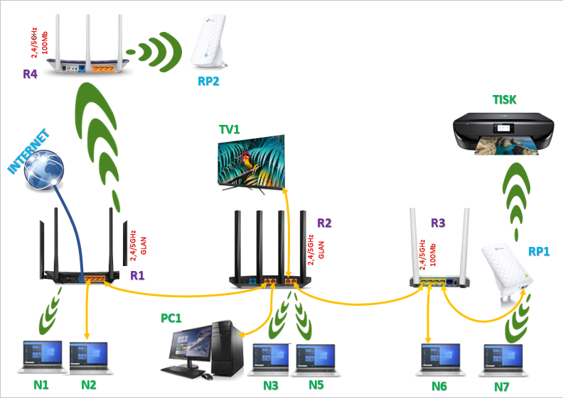 Nicmene vsechny routery by mely byt propojene kabelem (tzn ethernet nebo powerline)