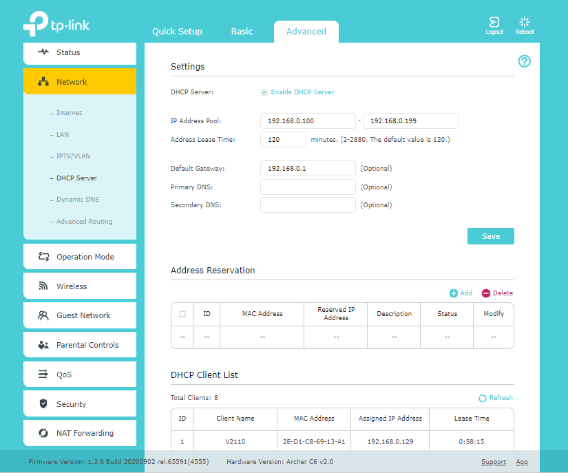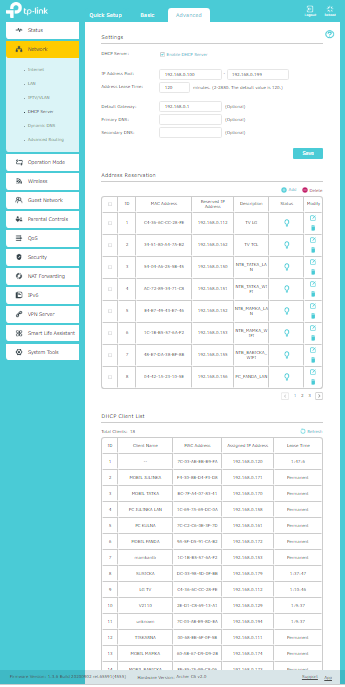 Address reservation - Kliknout na + ADD a mělo by jít zadat MAC adresa a IP adresa (v rozsahu DHCP) daného zařízení (routeru, tiskárny, mobilu, PC...). Po restartu daného zařízení bude mít již IP adresu, která je rezervovaná danému zařízení.