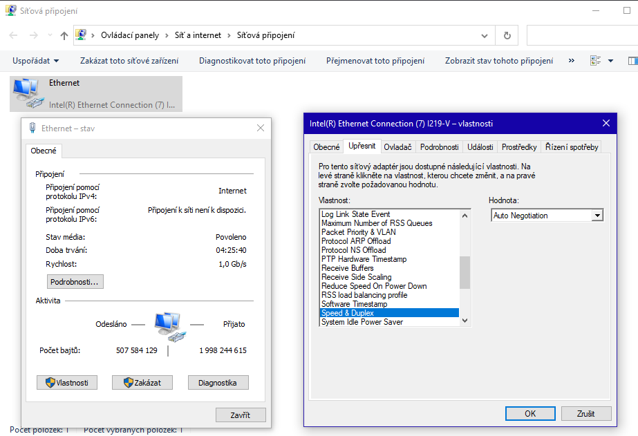 V nastavení sítového adaptéru mám nastaveno plně duplexní 1 Gbps ale windows mi ve vlastnostech site pořád ukazuje 100/100 (Mbps)
