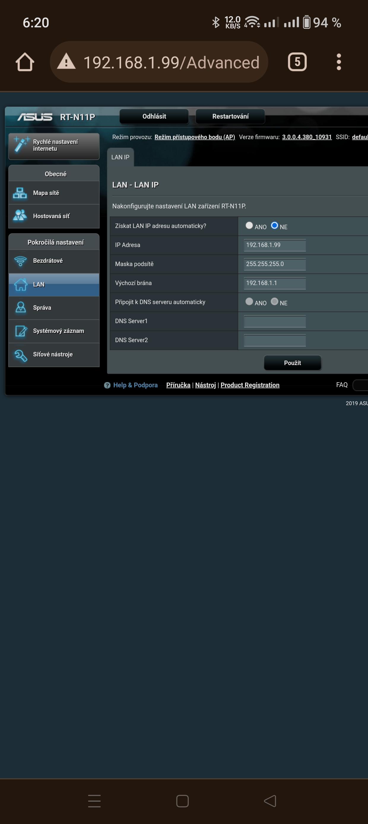 potřebuji poradit/pomoci. Něčemu málo rozumím, ale prakticky jsem laik v oblasti sítí, routerů atd. Mám doma X routerů. Jeden mám ve sklepě kvůli střídači, který umí pouze WIFI připojení. Tento router je napojený z hlavního routeru 192.168.1.100 kabelem. V routeru ve sklepě mám nastavenou IP 192.168.0.1 a název wifi FVE. K tomuto routeru jsem měl kabelem připojen PC, kde běžel Home Assistant. Včera jsem PC odpojil a nahradil ho Raspberry PI, který je rovněž připojen kabelem do routeru. Po tomto přepojení se některá zařízení nemůžou připojit na wifi síť FVE. Třeba telefon, notebook atd. Jen střídač a tablet se mi k wifi FVE připojil. Nevím si rady, proč se to začalo dít a jak to odstranit. Může mi někdo prosím s tím pomoci? Děkuji.