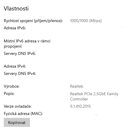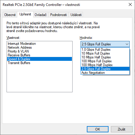 Moje karta ve Windows však z nějakého důvodu pracuje na 1Gbps: Zkoušel jsem též zkusit přepnout zde z auto negotiation na 2,5Gbps, ale beze změny, stejně běží na 1Gbps: Momentálně to tedy běží takto: