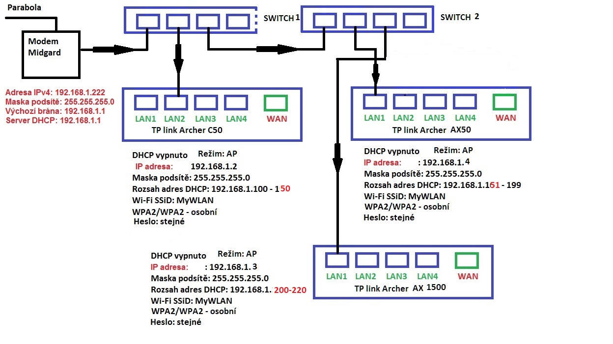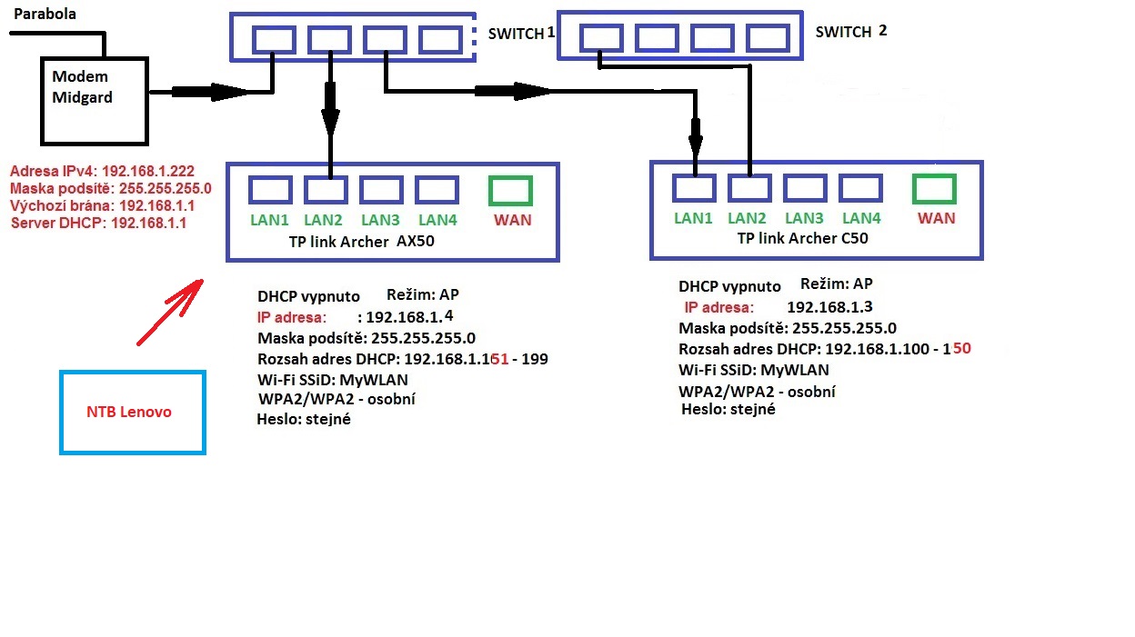 Díky za reakce, jen se zeptám: na všech routerech mám vypnuté DHCP, jsou v režimu AP. Modem na vstupu od paraboly (IP 192.168.1.1) je ve vlastnictví poskytovatele a do jeho nastavení nemám přístup. NTB se připojuje na Archer AX 50 dle opraveného obrázku. Původní už nebyl aktuální. Problém mám jen na NTB, ostatní zařízení problém nemají.