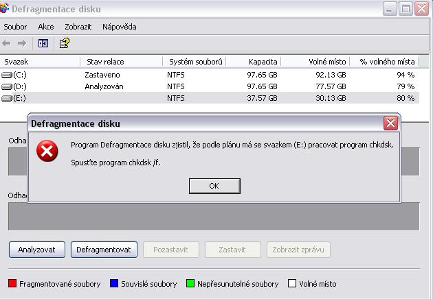Ještě je tu další problém. Při zapnutí začne probíhat chkdsk - kontrola disku (partition) E - vše O.K. Když potom zadám chkdsk /f, tak systém nemůže chkdsk/f najít. Když chci E defragmentovat, tak to hlásí viz. obrázek, ale zase chkdsk/f nenajde a to pořád dokola. ???