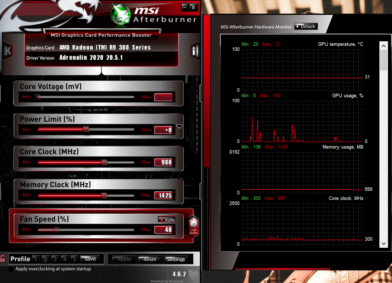 + ještě screen z Afterburneru, který právě sám reguluje ventilátory GK (upřímně, nevím, zda ho mám nastavený úplně ideálně..)