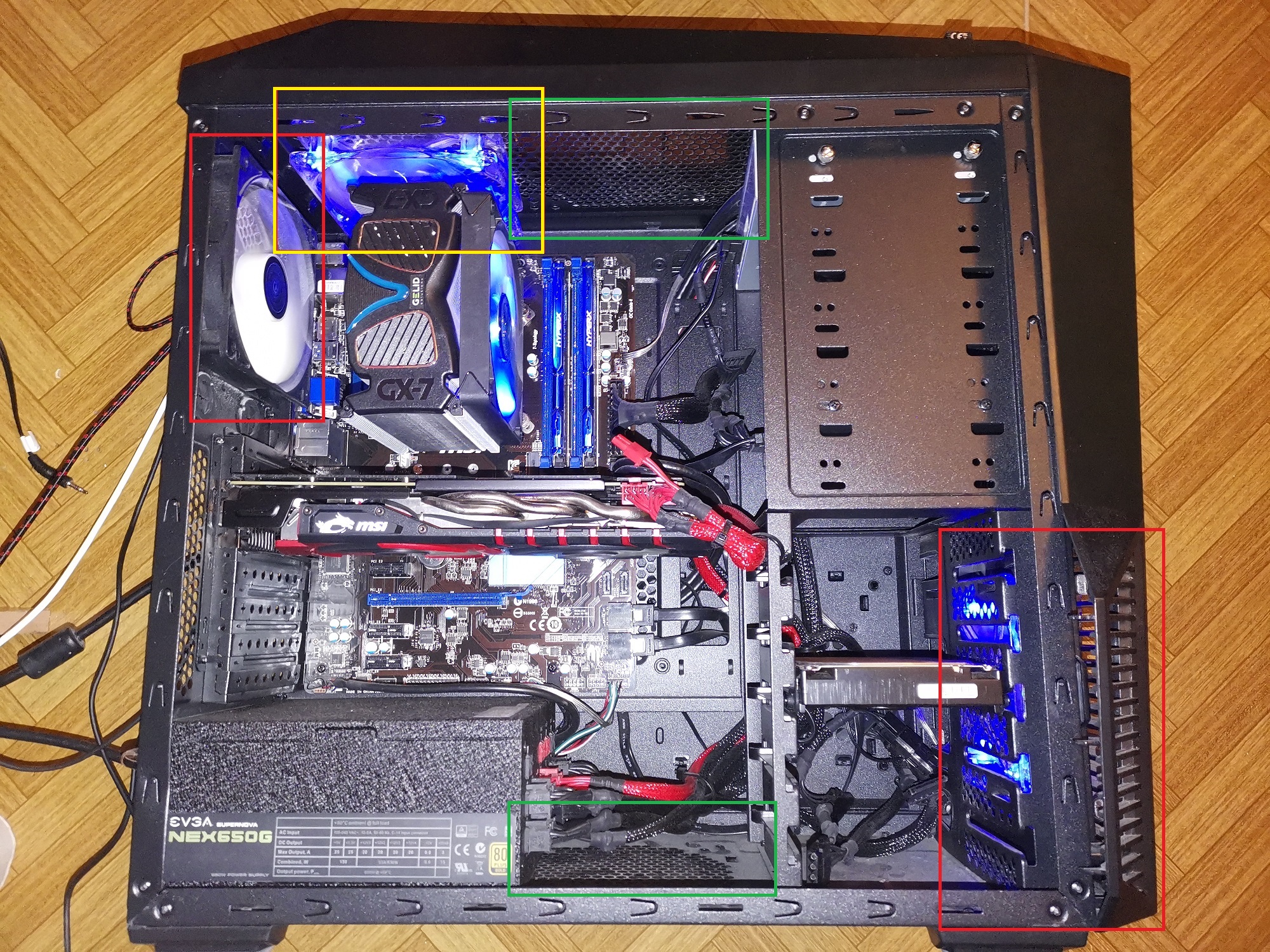 Nevím, jak ti úplně odpovědět na otázku, kam ventilátory foukají, takže přikládám zase obrázek z internetu, jak by se vzduch měl přes case asi v ideálním případě pohybovat.