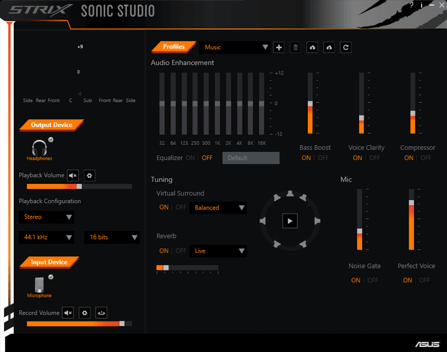 Sluchátka už fungují samy o sobě ale pro ty, kteří si chtějí ještě víc užít jejich funkce a vyladit si je přesně pro sebe třeba na nějakou hru nebo pořádní zážitek z filmu tak si můžou naistalovat software na jejich ovládání jménem STRIX Sonic Studio kde si můžete vyladit vše co potřebujete (Najdete ho na oficiálních stránkách ASUS (POUZE PC)).