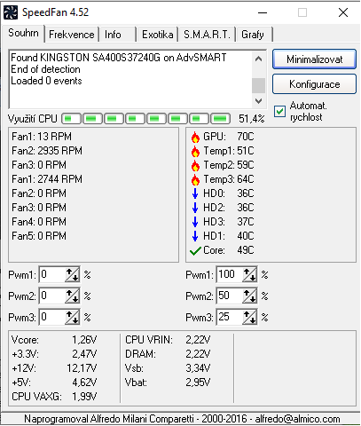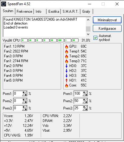 Mám takový zvláštní dotaz, jelikož jsem "lajk" a PC používám (stolní) jen na hry a občas nějáké ty filmy, nevím zda teploty (viz. fotky) jsou v tzv. v "normě". PC mi skládal kamarád, ale již při jeho "kabeláži" pokud se tomu teda dá takhle říkat, mi to něják nesedělo, ale jak říkám, jsem lajk a cenovku jakou mi za tenhle "low end" herní PC nabídl byla příznivá a tak jsem si řekl proč ne, vždyť to bude jen na hry.. (na práci atp. mám notebook) PC nemám niják výrazně dlouhou dobu a už mi začíná "zlobit" přijde mi, že PC je hlučnější než kdy dříve, známý mi přepastoval procesor, vyčistil všechny komponenty od prachu a stejně je to na mě moc "hlučné" disky jsou v pořádku, možná nějáký ten větráček, dost možná ten na procesoru a proto se obracím na Vás. Udělal jsem snímky obrazovky přes program "SPEEDFAN" při zátěži ve hře GTA 5 a chtěl bych se zeptat, zda jsou hodnoty na fotkách podle Vás "NORMÁLNÍ". Díky moc a hezký zbytek večera! :-) Karel