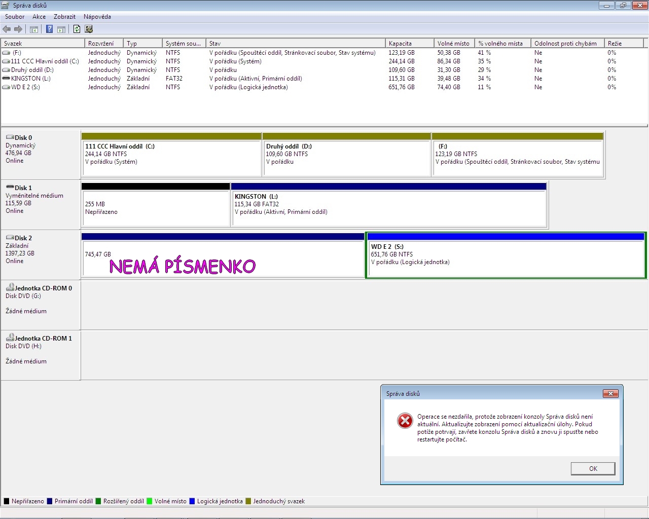 ve Windows 7 připojím eterní USB 3 harddisk a jeden oddíl nevidím. Jsou tam data. Nemůžu mu přiřadit písmenko.