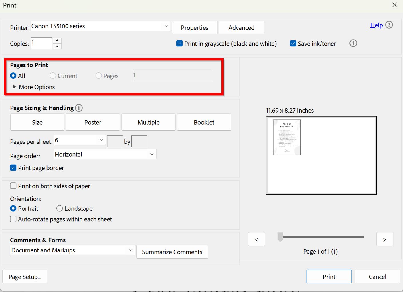 Ahoj, před pár dny jsem si koupil tuto tiskárnu (Canon Pixma TS5150) a funguje skvěle. Mám ale jeden malý problém s tiskem více stránek na jeden list ve Windows 11. Na jiném zařízení (Mac) to funguje bez problémů… Problém je jen ve Windows – když zvolím tisk více stránek na jeden list, obsah se v náhledu správně zmenší (například při volbě 4 stránek na list to zmenší náhled na čtvrtinu papíru, což je v pořádku), ale při samotném tisku se vytiskne jen jedna stránka z náhledu, ne všechny.