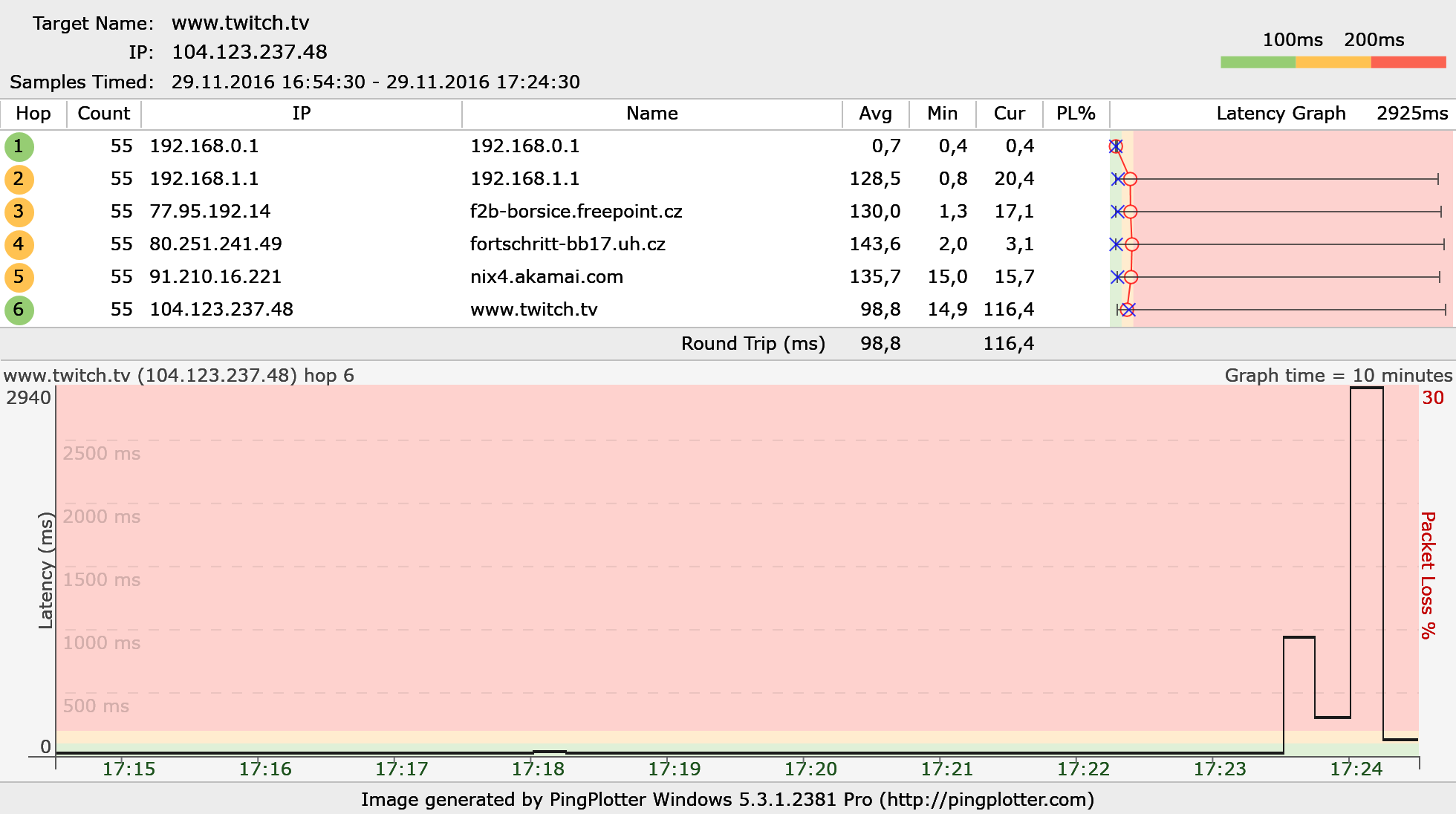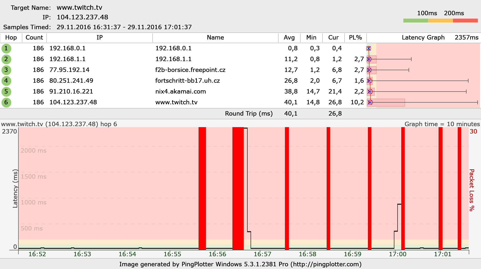 Určitě, ale je potřeba zjistit, co je zařízení s IP adresou 192.168.1.1, protože k výpadkům dochází někde mezi prvním a druhým skokem. První skok - 192.168.0.1 je předpokládám tvůj router. Když zadáš tu IP do adresního řádku v prohlížeči, tak se otevře web. konfig. rozhraní tvého routeru. Souhlasí to?