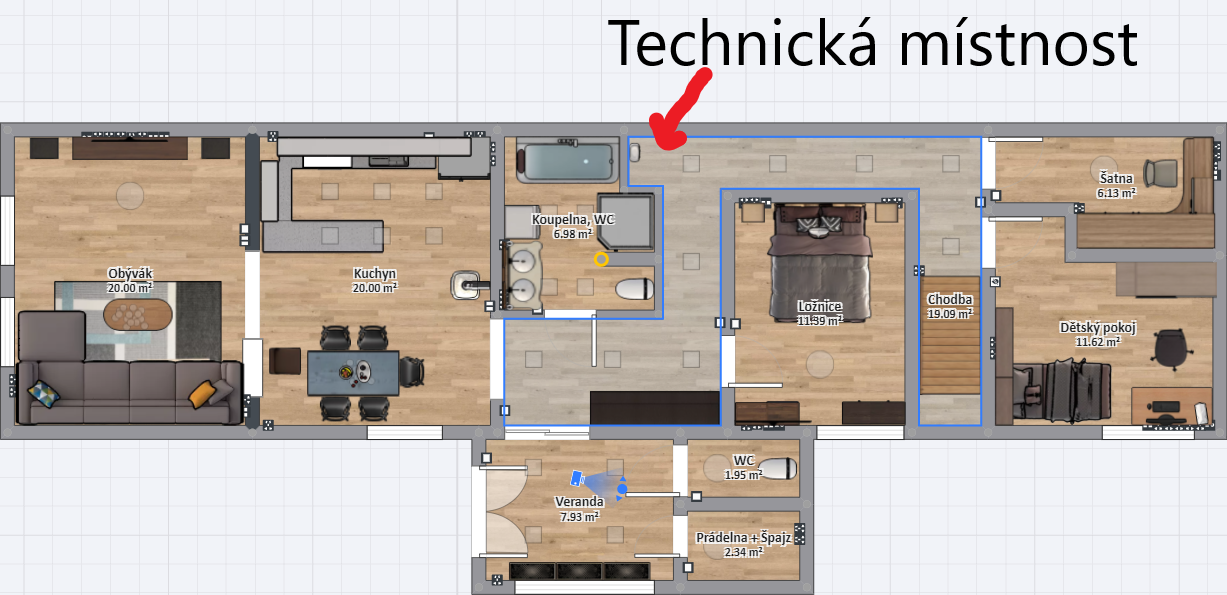 Já tahal všude CAT6a, radši vše naddimenzuji. Trochu jsem potom ostrouhal s velikostí technické místnosti, kam se mi rack vešel jenom ke stropu s horším přístupem, ale povedlo se, takže to bych taky nepodceňoval, když vidím šipku, kde bude technická místnost. Záleží tedy, co v ní všechno bude (podle obrázku to vypadá, že se příčka mezi vanou a tech. místností dá ještě posunout doleva