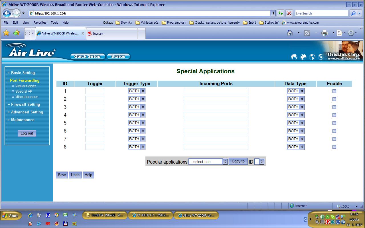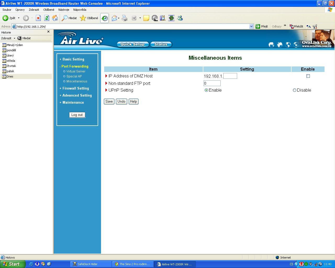 Vůbec nevim jak nastavit porty a kde.. posílám pár printscreenů obrazovky s nastavením routeru.. jelikož nevim co a kam vyplnit.. router má zároveň i svůj firewall, ale tam taky nevim, jestli něco povolovat, nebo nastavovat..