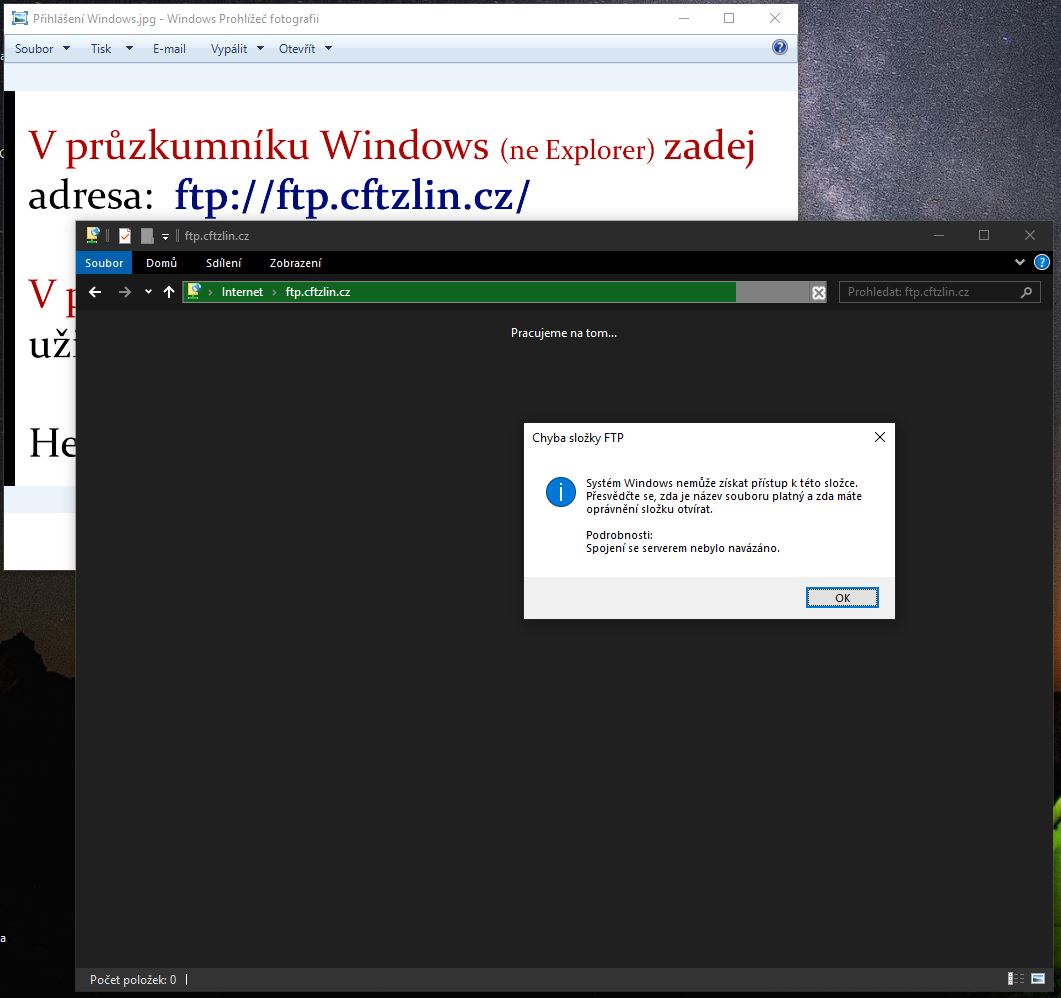 Otevřu "TENTO POČÍTAČ", pod zařízením a jednotkami je složka "UMÍSTĚNÍ V SÍTI" a v ní vidím ikonu pro spojení na klubový FTP server. Nyní, když se přes něj pokusím spojit otevře se okno s názvem "Chyba složky FTP" a v něm hláška "Systém Windows nemůže získat přístup k této složce. Přesvědčte se, zda je název souboru platný a zda máte oprávnění složku otvírat. Podrobnosti: Spojení se serverem nebylo navázáno." Zkoušel jsem toto spojení 2x odstranit a vytvořit nové a vše se stejným výsledkem.