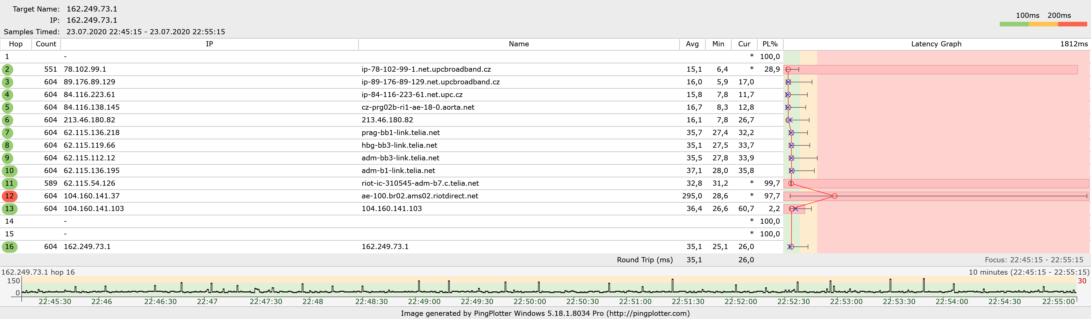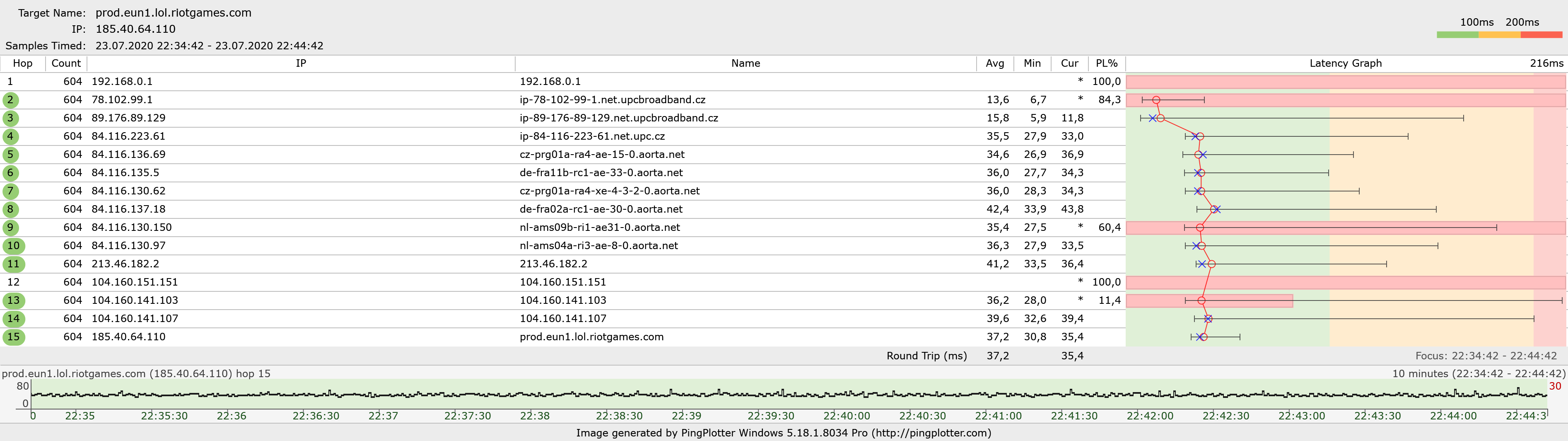 Dobrý den, mám problém s vysokou odezvou a packet lossem z herních serverů League of Legends po chvíli řešení problémů s hráčskou podporou jsem se od nich dozvěděl, že většina paketů se ztratí už když signál odchází z mého pc. Problém trvá docela dlouho tak jsem už vyměnil modem ale je to stejné. Neví někdo, čím by to mohlo být ?