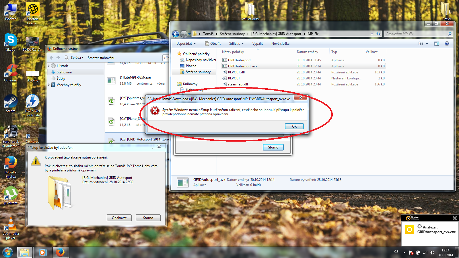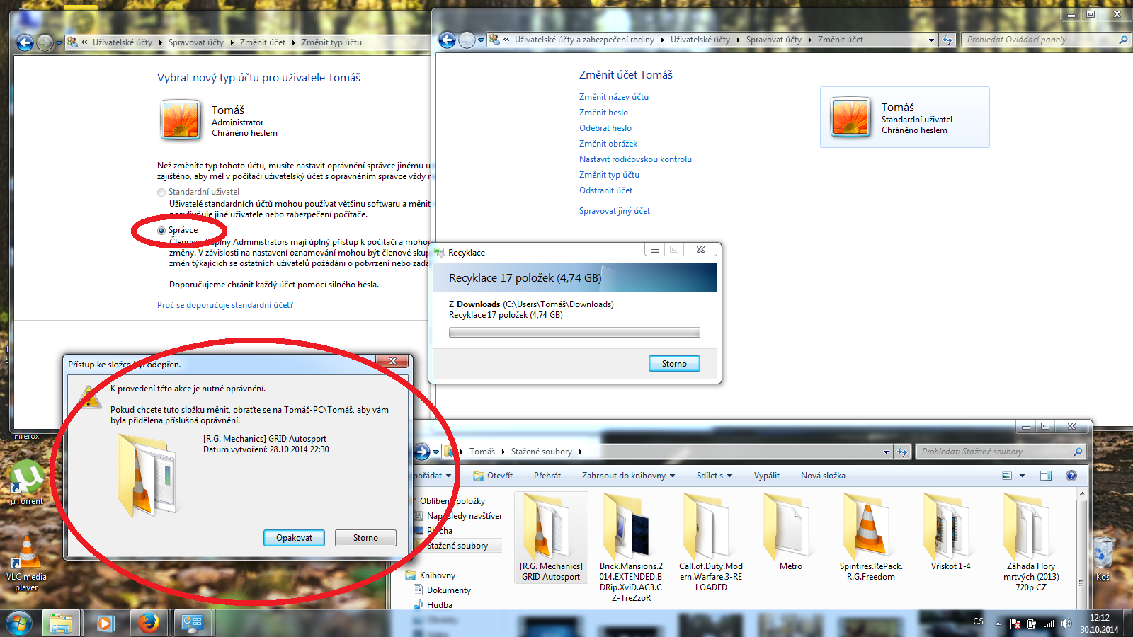 Zdravím všechny:) přeinstaloval jsem komplet cely PC zase na W7, ve windowsech mam vytvoreny jediny učet,ale když chci neco smazat třeba ze staženych souboru,napíše mi to,že nemám dostatečné oprávnění (VIZ.FOTO) .. a když si stáhnu nejakou hru,a chci ji nainstalovat napíše mi to taky chybu,že nemám dostatečné oprávnění (VIZ.FOTO ) .. snad mi tu nekdo pomuže:)