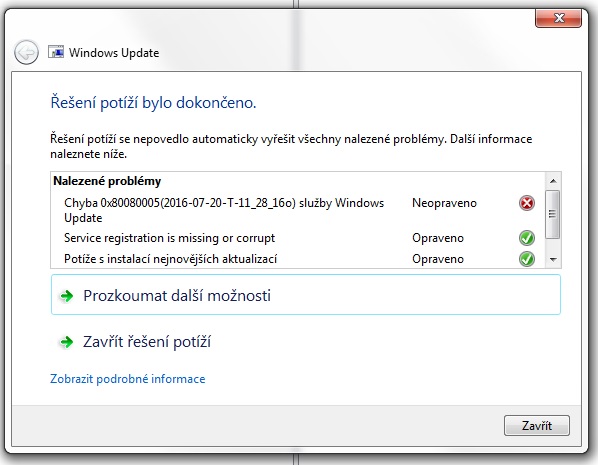 Já jsem to vzdal, pomocí WSUS jsem nainstaloval aktualizace ručně, zkoušel jsem po úspěšném nainstalování Windows Update a opět nic, zelený flek a hledal a hledal.