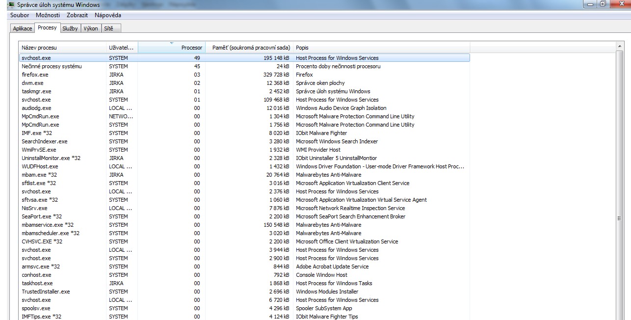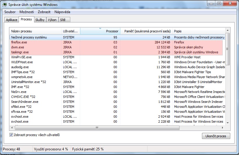 Změnilo, myslím, že takto by to bylo v pohodě. Nemůžu přeci ale nechat vypnutou aktualizaci natrvalo. Jediné, co pak tam je ještě za zátěž jsem očervenil v obrázku. To si myslím, že ale už tak má být. Firexox má v tuto chvílí 10- 15 a využití procesoru na 10-15pocentech. Jinak v klidu bez zapnutí Firefoxu jsem chvílema i na 0% využití procesoru.