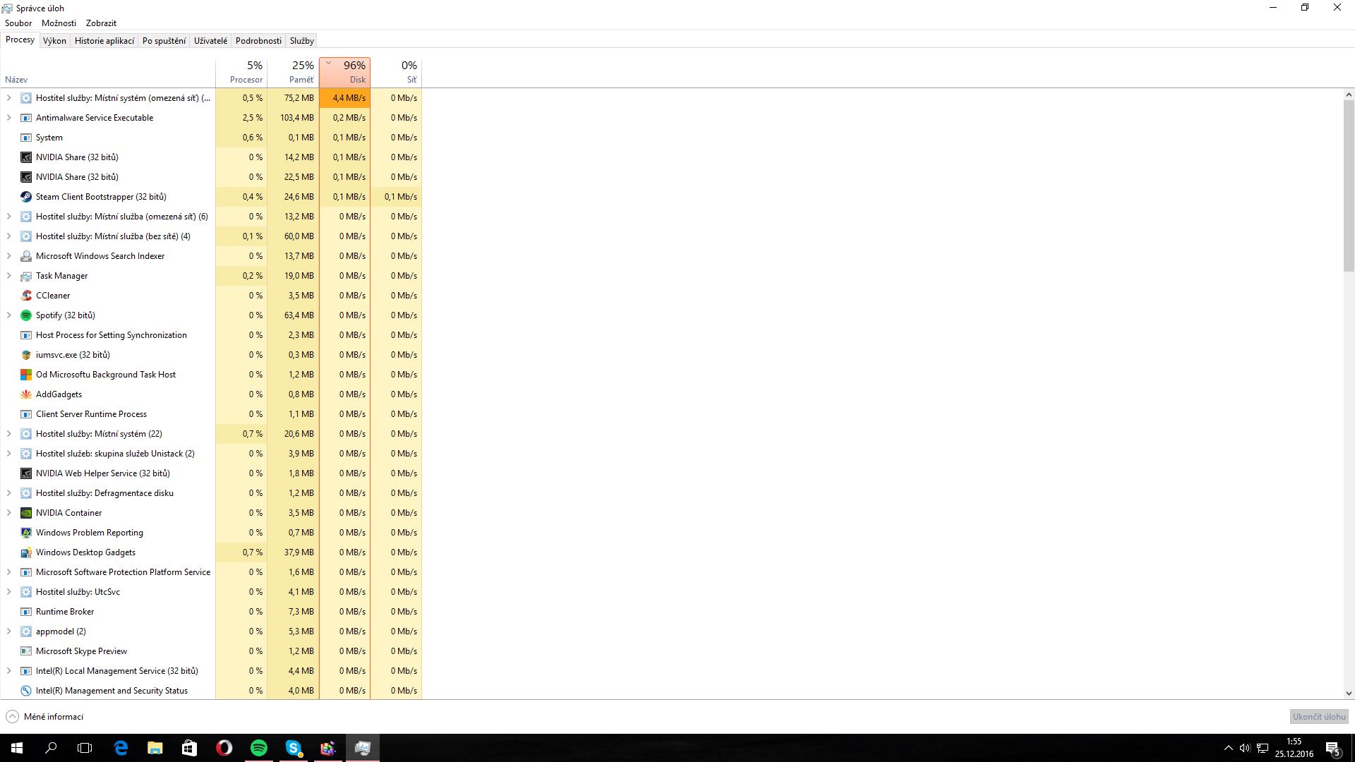 Zdravím, řeším problém s HDD, neustále jede na 95-100%, procesy viz foto, projeto ccleanerem, žádný zbytečný SW jsem nenašel, antivirus čisto, defragmentace proběhla ... už nevím co dál
