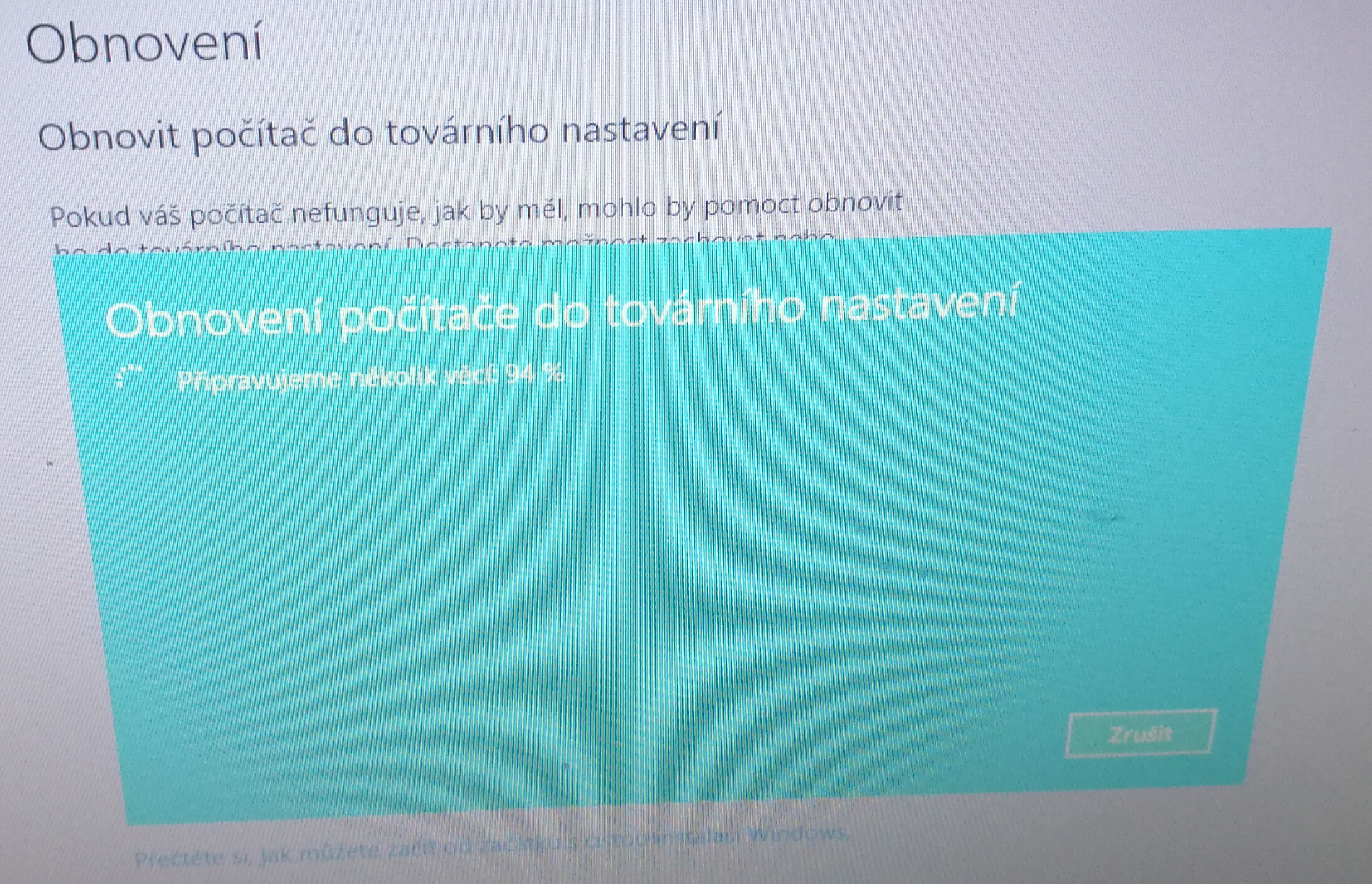Zdravím, z důvodu zasekaného notebooku jsem po záloze souborů provedl obnovu do továrního nastavení. Tu úplnou, bez zachování dat. Po dvou hodinách od spuštění kdy jsem se vrátil domů to psalo: "připravujeme několik věcí 94%". Jenže přes noc po dalších 14h to stále píše to samé, stejné procenta. Mám sice plný disk souborů a různých programů, počítač taky žádná třída, starý 2 roky za 11tis, ale že by to trvalo tak dlouho? Mám čekat, nebo jak mám teď postupovat dál?