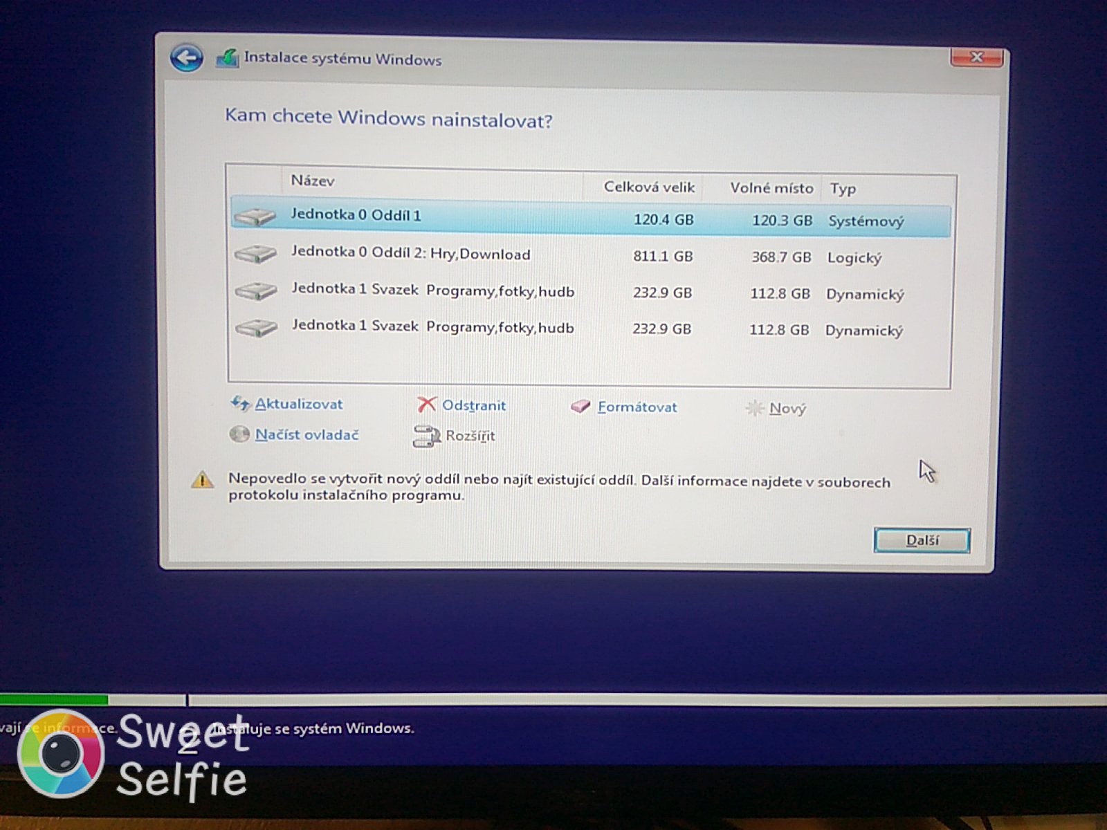 Dostanu se do win instalace dělala to mechanika ale problém viz příloha formatuji systémový oddíl vyberu ho a potvrdím a napíše mi to to co je na te fotce