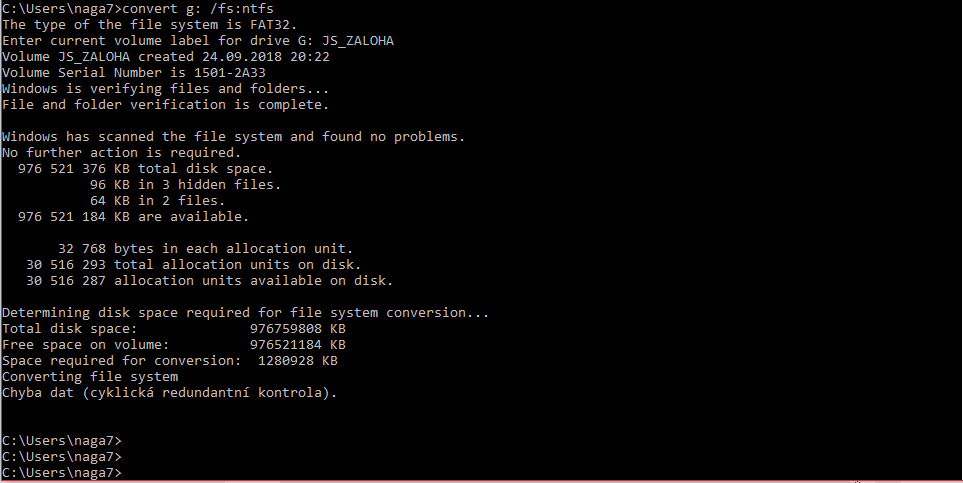 Re: Chyba po převodu formátu HDD disku z FAT32 na NTFS