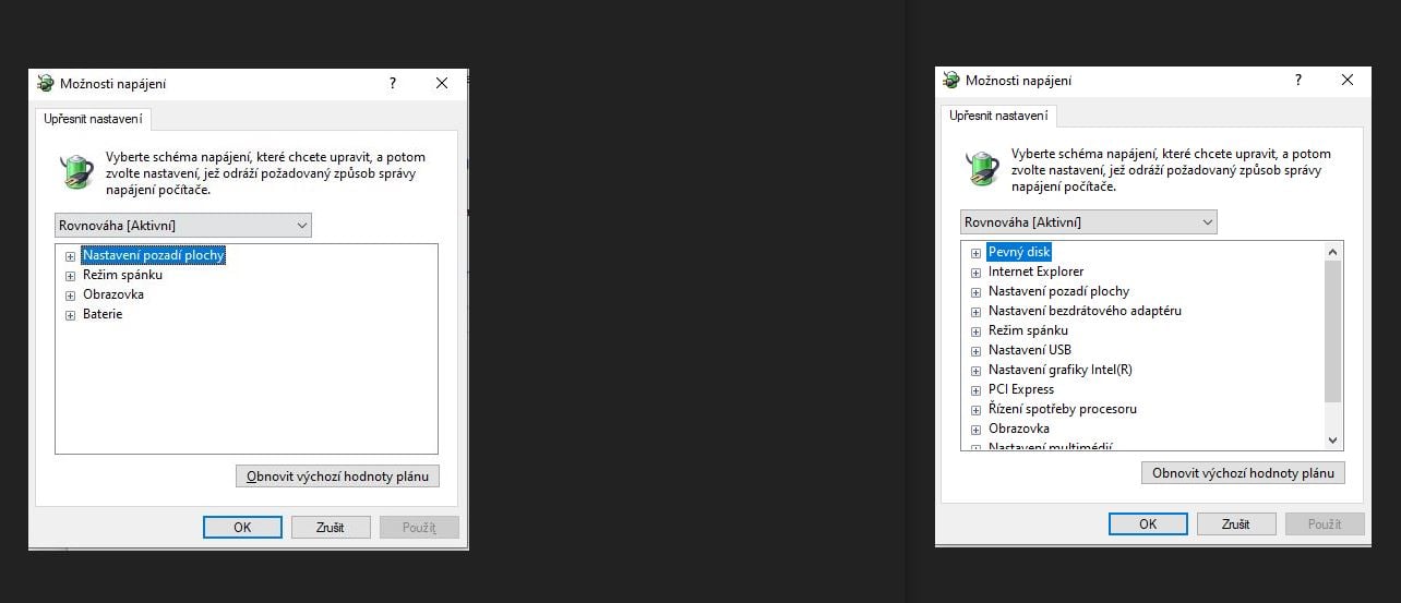 Všiml jsem si, že notebooky, které mají problém s uspáním, tak mají "osekané" možnosti napájení (viz foto vlevo). Dále ve správci zařízení ve vlastnostech jednotlivých komponent chybí záložka "Řízení spotřeby".