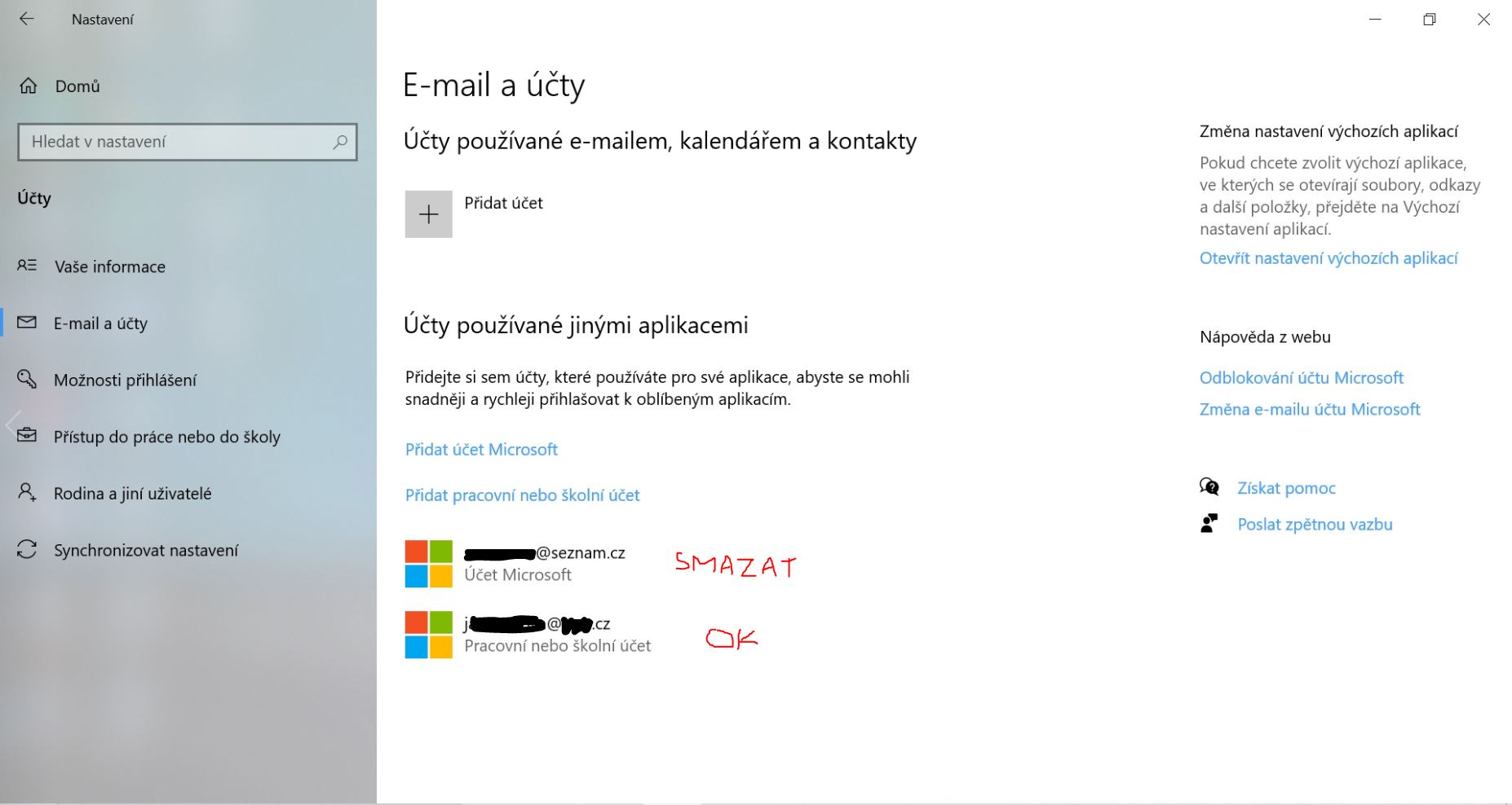 Bohužel podle návodu, který si mi poslal, účet smazat nejde. Já ten účet ke smazání nevidím v "Rodina a jiní uživatelé", jak je uvedeno v návodu. V "Rodina a jiní uživatelé" nemám žádný účet. Já ten účet mám v "Email a účty" v Nastavení počítače. A odtud se mi ho smazat nedaří. Nebo nevím, jak na to