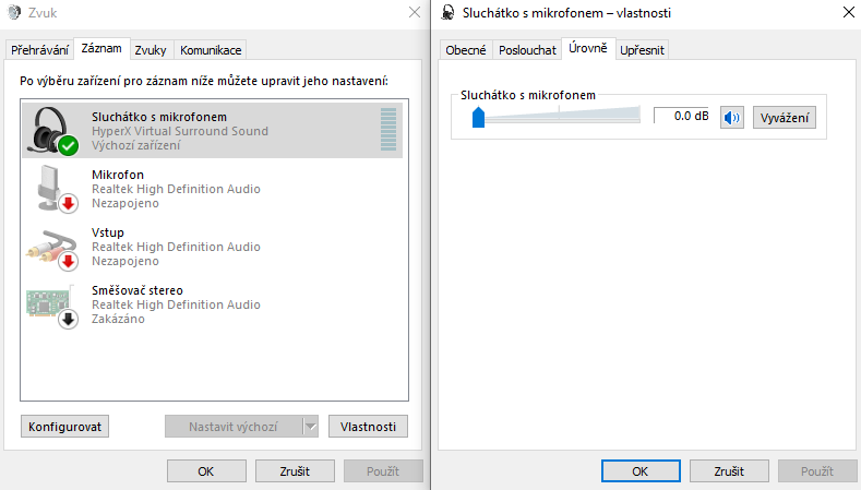 Pokud používáš USB control box, tak reguluješ úrovně jen na něm a regulace ve Windows není funkční. Musel bys zapojit headset přes Jack konektory.