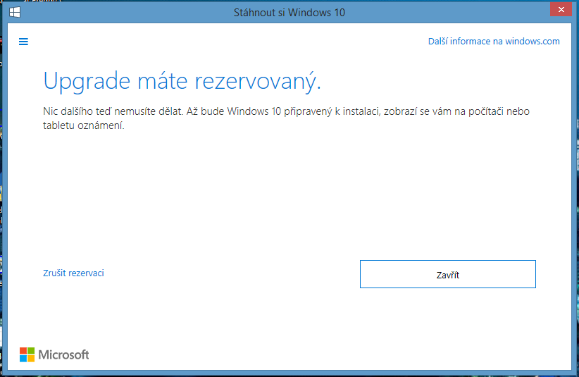 :-D Já vám to říkala že to příjde a microsoft bude tohle rvát každému do počítače. Já už je seřvala po telefoně. Ta mi jen řekla paní že mám odstranit veškeré Updaty pro windows 10. odstranit GWX . ale o to nic V pravo dejte v tom programu ty tři čárky . A tam je zobrazení potvrzení :-D . A tam je rezervovaná Windows 10 ! . Aniž by jste na to klikli . ani já jsem o tom nevěděla .