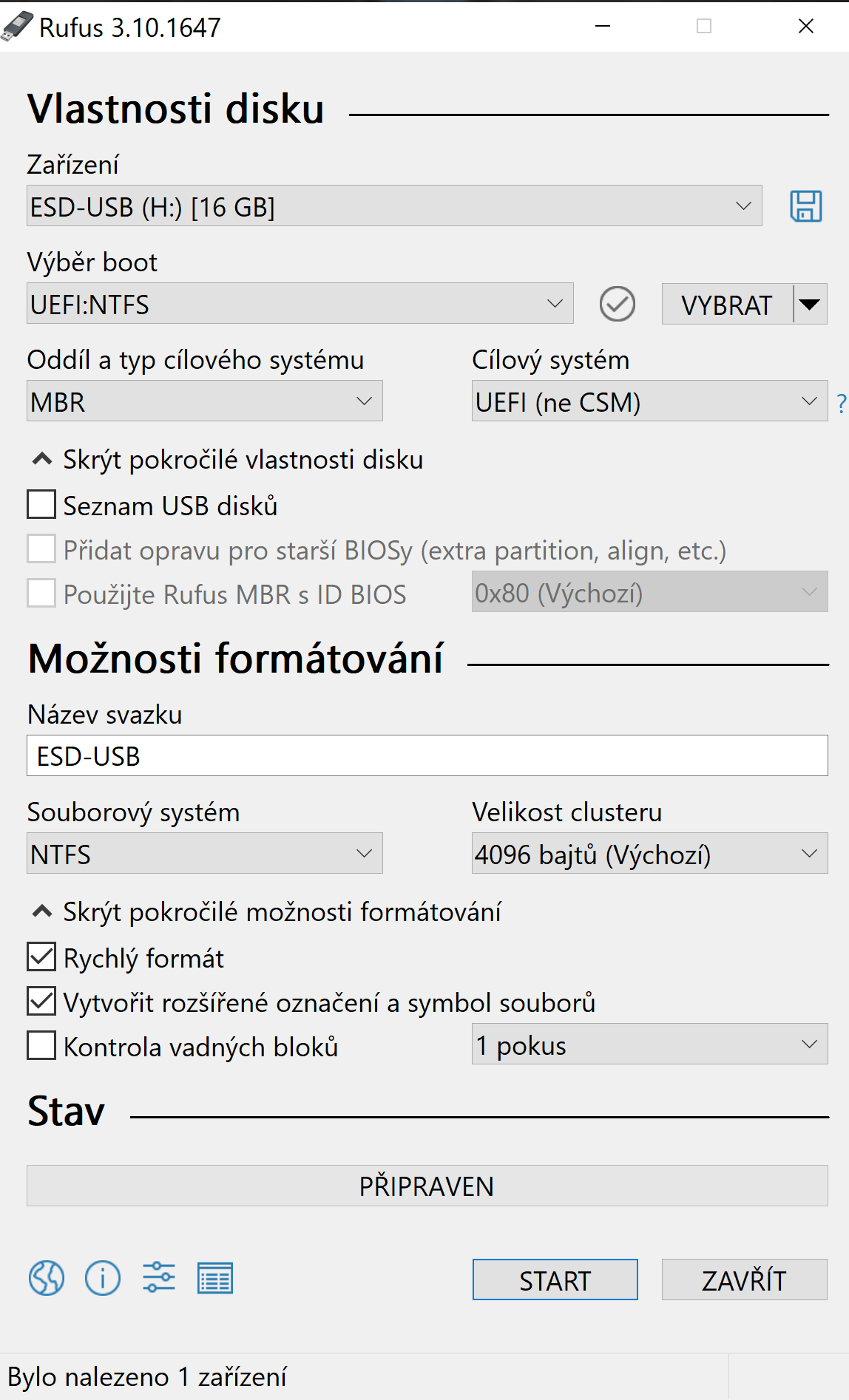 Na tom screene z Rufusu ani si nevybral žiadné ISO s Win10.Ak by si vybral,tak nemáš tam čo meniť,okrem schémy oddielu.Takže niečo robíš zle.Ktorý OS sa Ti spúšťa pri zapojení oboch diskov?Daj sem screen zo Správa diskov.