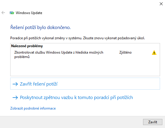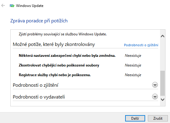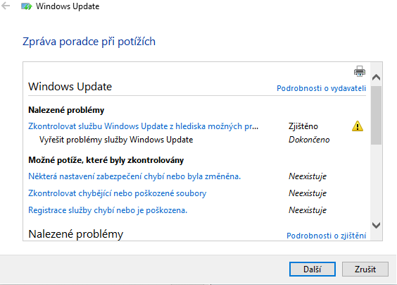 Toto jsem zkoušela předtím, výsledek toho analyzování si už nepamatuji, ale nepomohlo to. Teď jsem to zkoušela na tvůj popud znova a výsledek byl hodný automatickým řešením Windowsu, tedy doporučení, že by bylo vhodné zkontrolovat Windows Update z hlediska možných problémů. Krásná věc - program, který má odhalit a vyřešit problém, ti napíše, že by bylo vhodné zkontrolovat, jestli není problém.