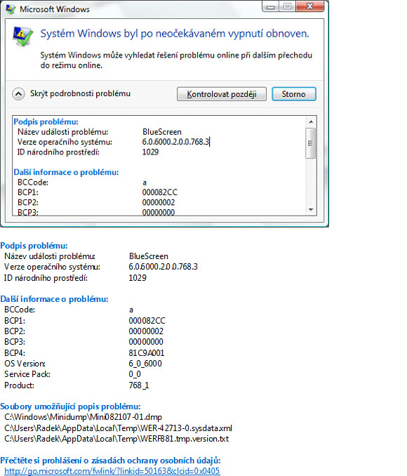 Prosím o radu a pomoc, asi před 3. týdny mi poprvé při startu OS Vista HP vyběhla "modrá smrt" :o Poté OS myslím restartoval a nabídl mi něco jako "spustit autoopravu" nebo co.. po chvíli práce mi to vyhodilo řešení, že se OS pokusí vrátit k poslednímu známému bodu obnovení, před problémem. Poté již OS normálně nastartuje.