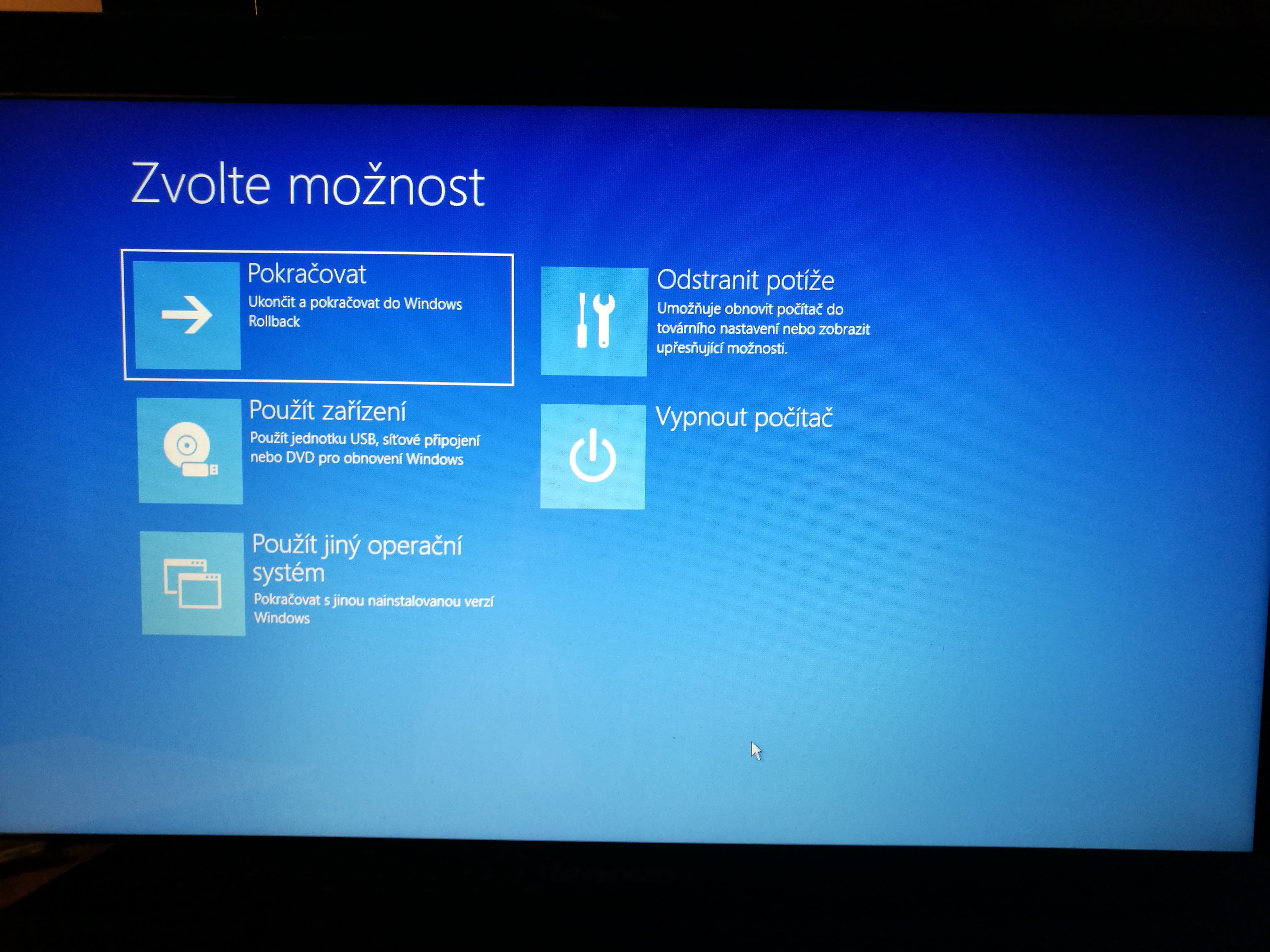 včera se mi objevila aktualizace systému, tak sem ji přijal a po aktualizování se mi to hodilo do tohoto menu (viz obrázek). Rollback nefunguje, restartuje se systém znovu do tohoto menu ... obnovení systému by šlo nejspíš pouze jen do továrních dat, protože není vytvořena záloha. Windows 10 nemám bohužel ani na dvd ani na flashce. Moc prosím o radu.