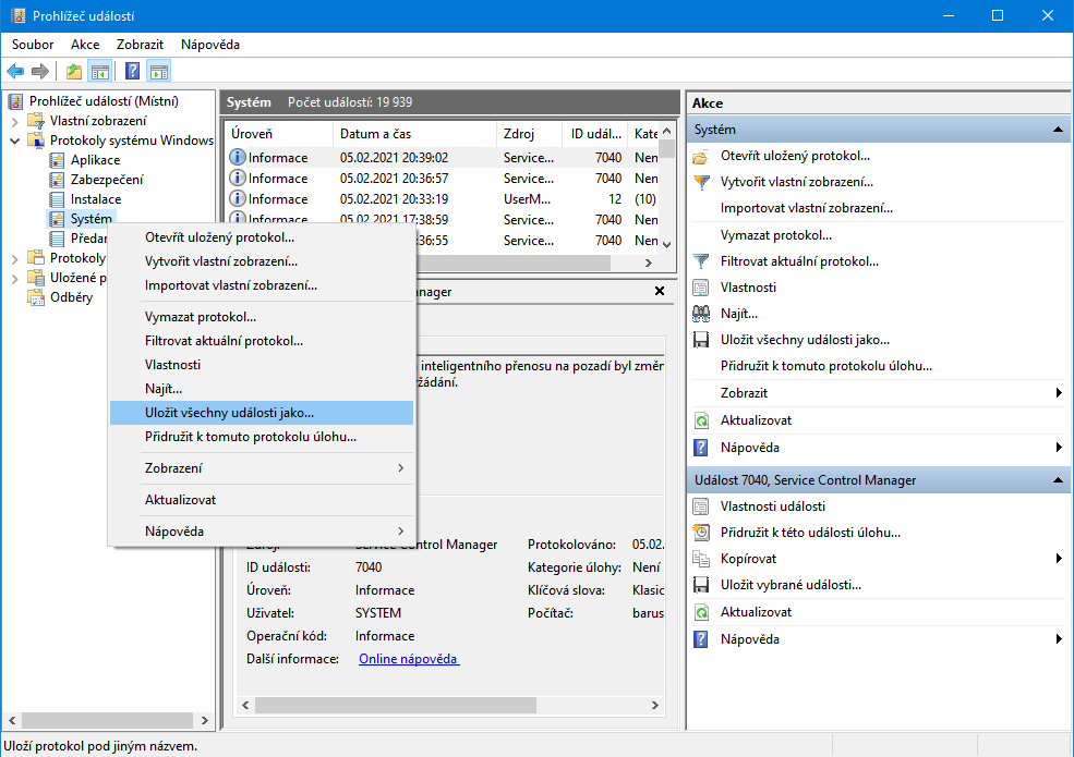 Úroveň Datum a čas Zdroj ID události Kategorie úlohy