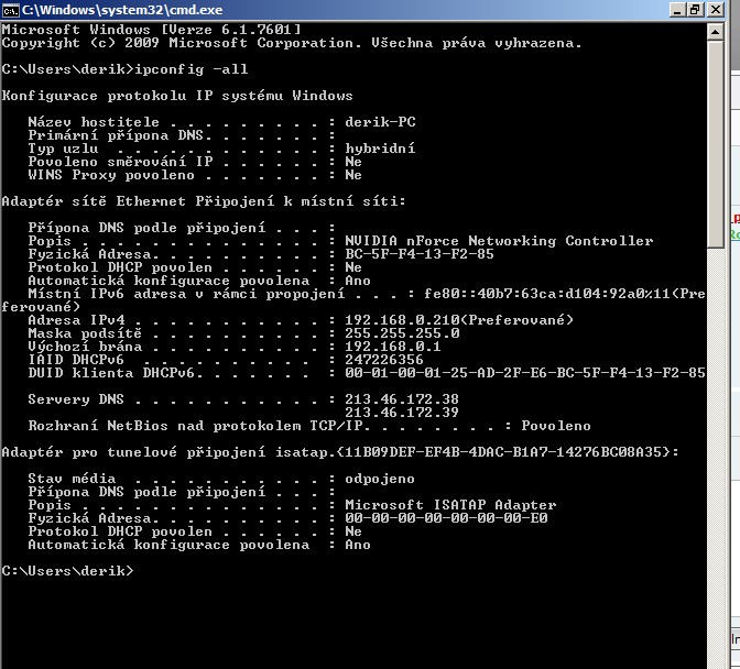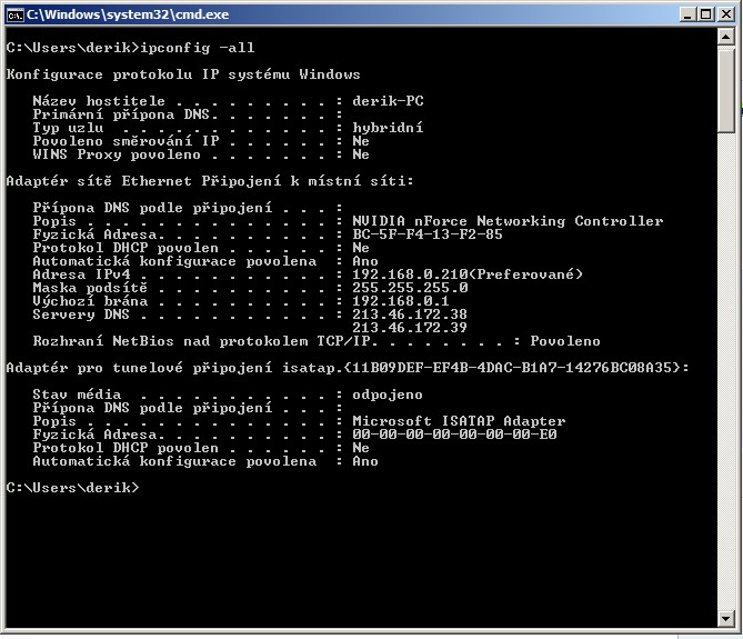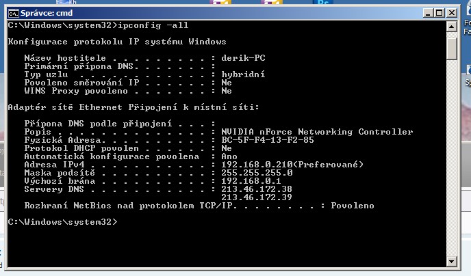 Dej sem výpis ipconfig -all.