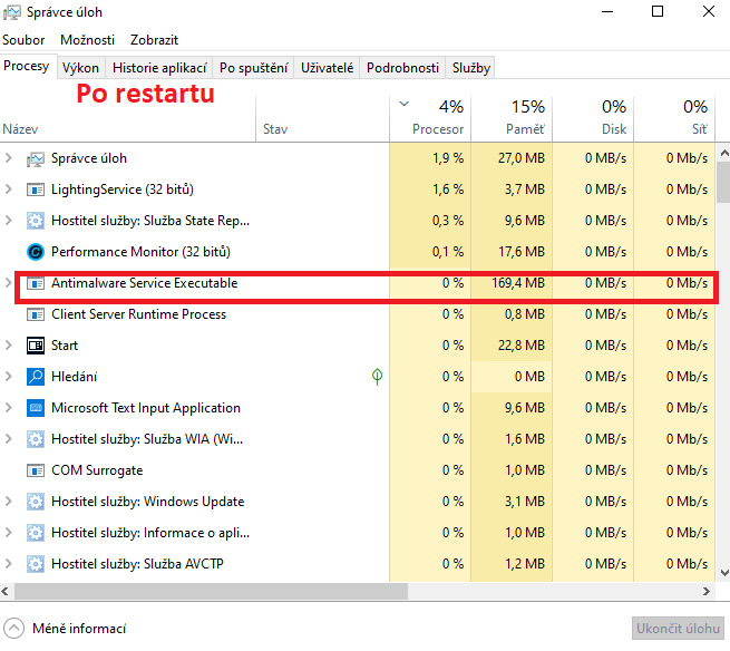 Po restartu všechno v pořádku a procesy se zdají "přirozené". Restart musí být ale natvrdo přes tlačítko na skříni. Když ho dávám přes Windows, tak to trvá dlouho s tím, že se kolečko procesu restartu zasekává. Ani po půl hodině se počítač nerestartuje.