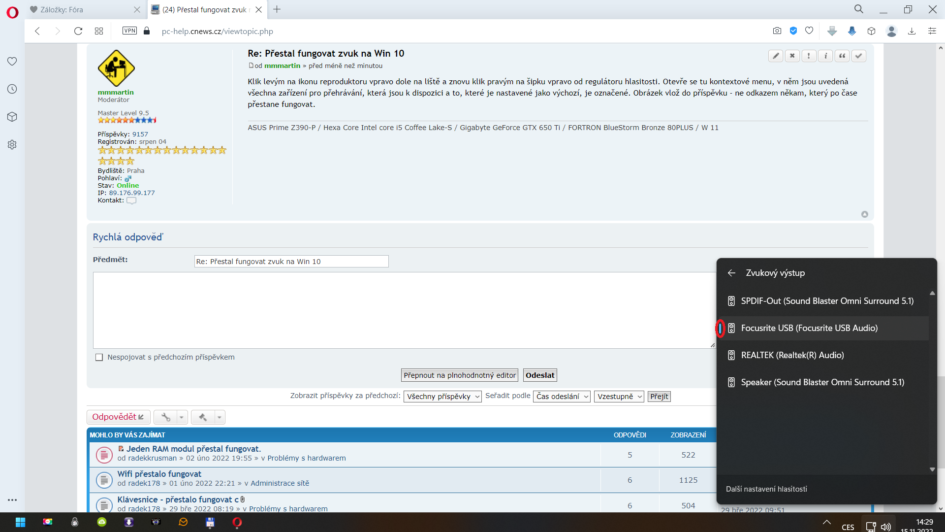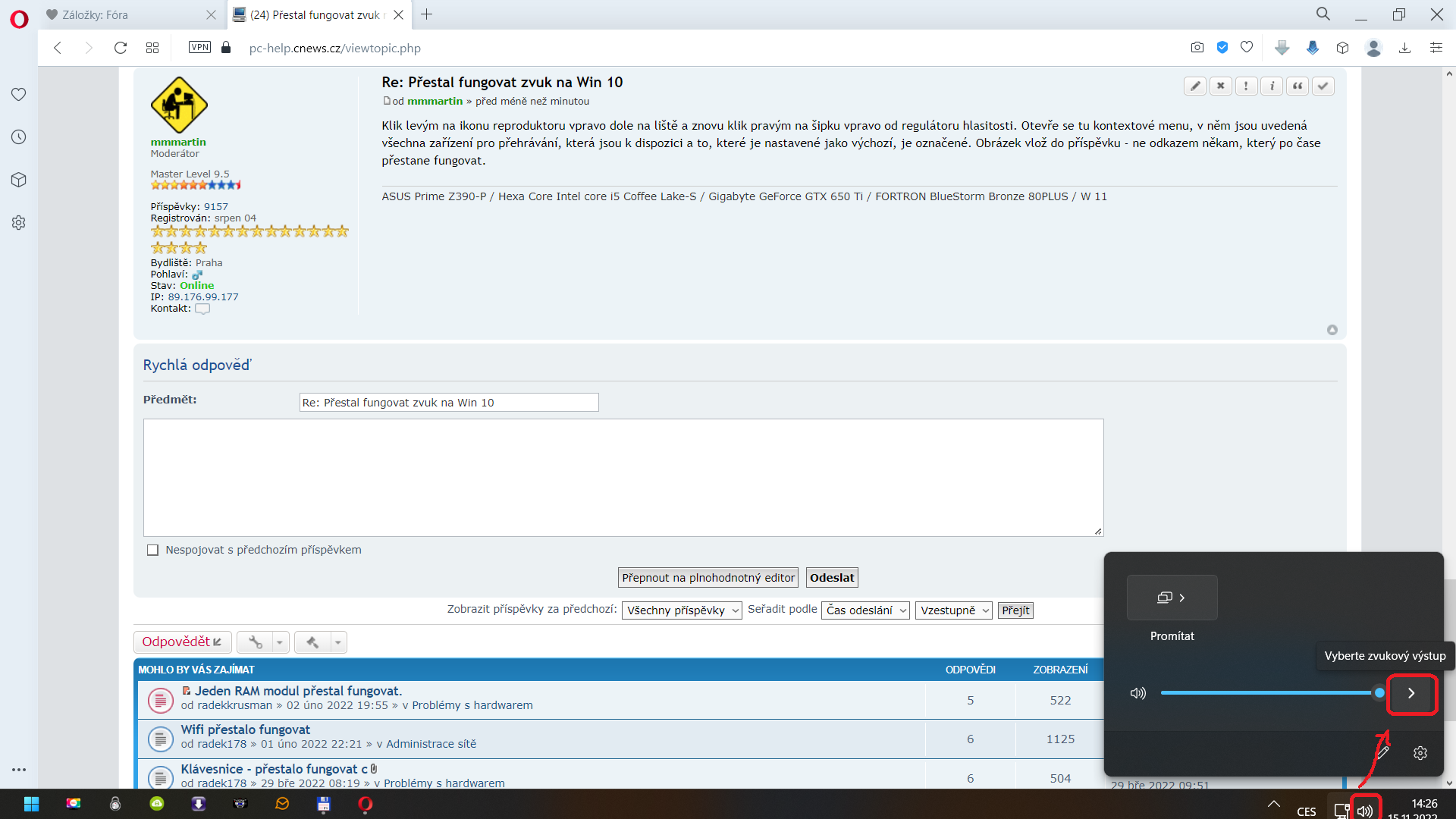 Právě že v nastavení jde ten zvuk normálně slyšet, proto vnímám, že nepůjde o HW závadu. Ale ve směšovači hlasitosti ukazuje zvuky jen bargraf a zvuky už nejdou. Vesměs nastavení - test zařízení je jediným místem, kde se zvuky přehrají, jinak nikde.
