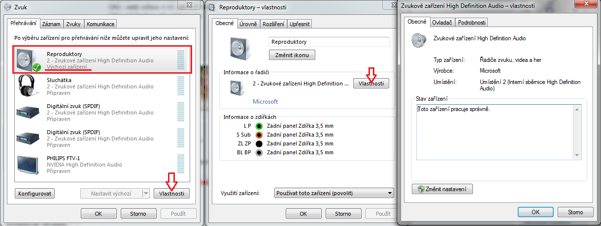 Ano, zobrazilo se to, kde jsem už byl - přes Ovládací panely. Jako výchozí (a jediné možné) zařízení je výše uvedený Realtek, test opět funkční, zvuk kdekoli jinde ale ne.