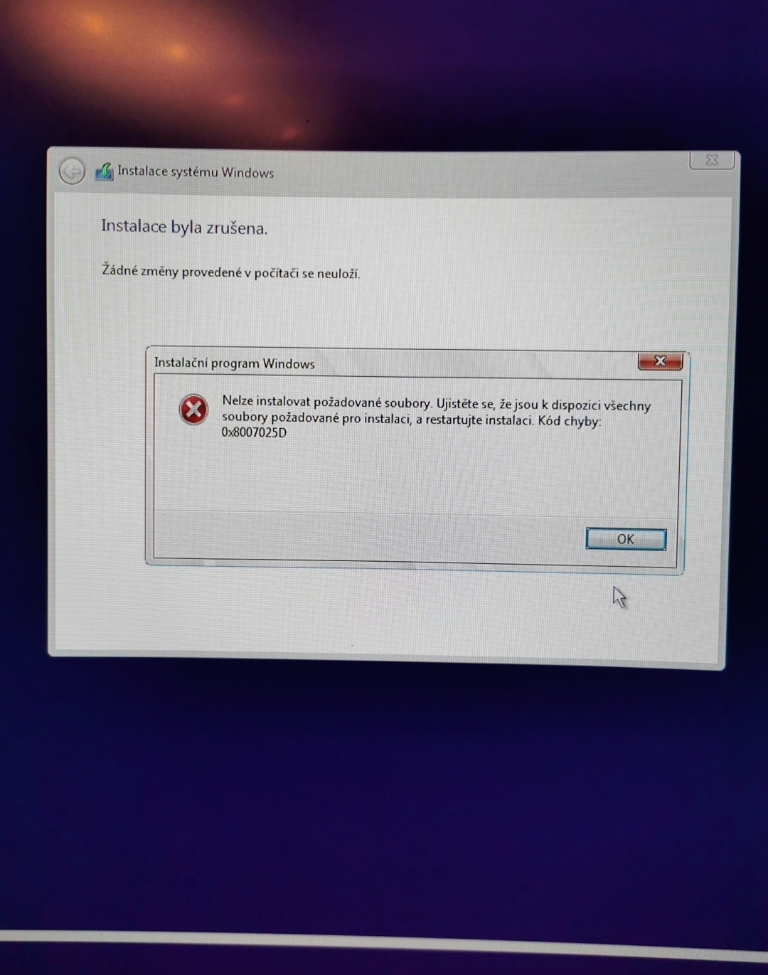 Dobře, zkusím. Ještě předtím jsem ale udělal z flashky nové instalační médium a nyní jiná chyba. Viz foto
