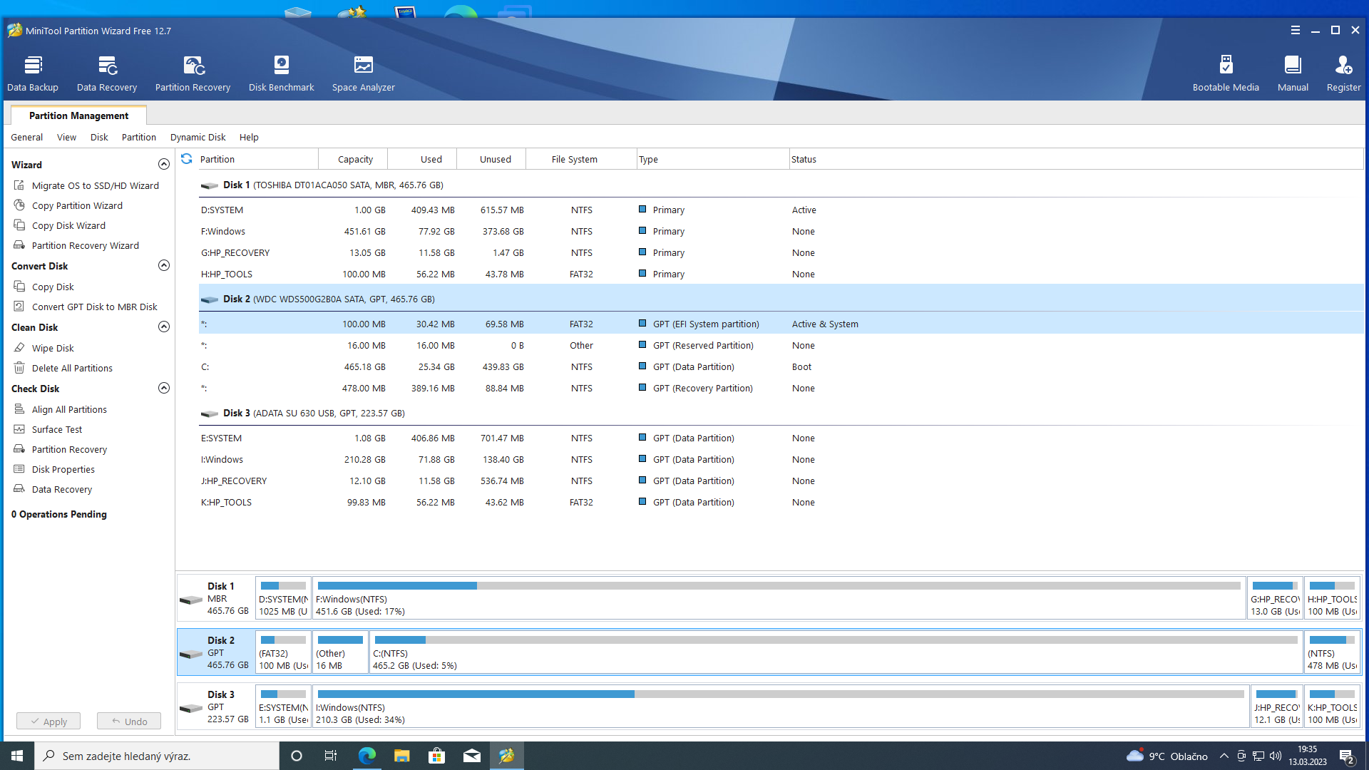 Nebo rucne opravit (smazat E: a misto nej udelat EFI a MSR). Zmenu MBR na GPT W10 snadno preziji a pro SSD je vhodnejsi.